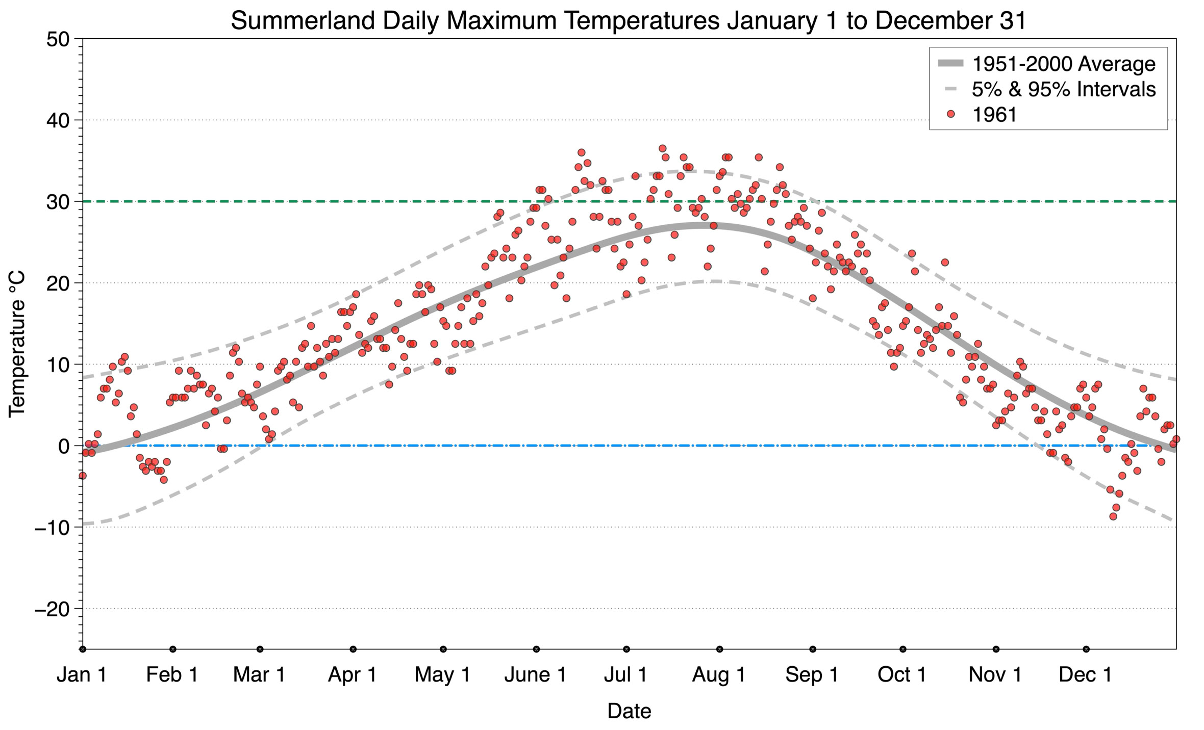 The graph below displays the day-to-day values of maximum daily temperature (red dots) at Summerland for the year 1961. On this graph, the dark grey thick center line is the average daily temperature calculated from 50 years of data from 1951 to 2000. The dotted light grey lines are the 5% and 95% probability intervals - about 90% of the data from 1951 to 2000 fell within these boundaries. Daily temperatures can be considered as extreme cold or extreme hot events if they that fall outside the 5% or 95% probability intervals, respectively. In Canada, temperatures above 30°C (green dotted line) are considered extreme daily temperatures.