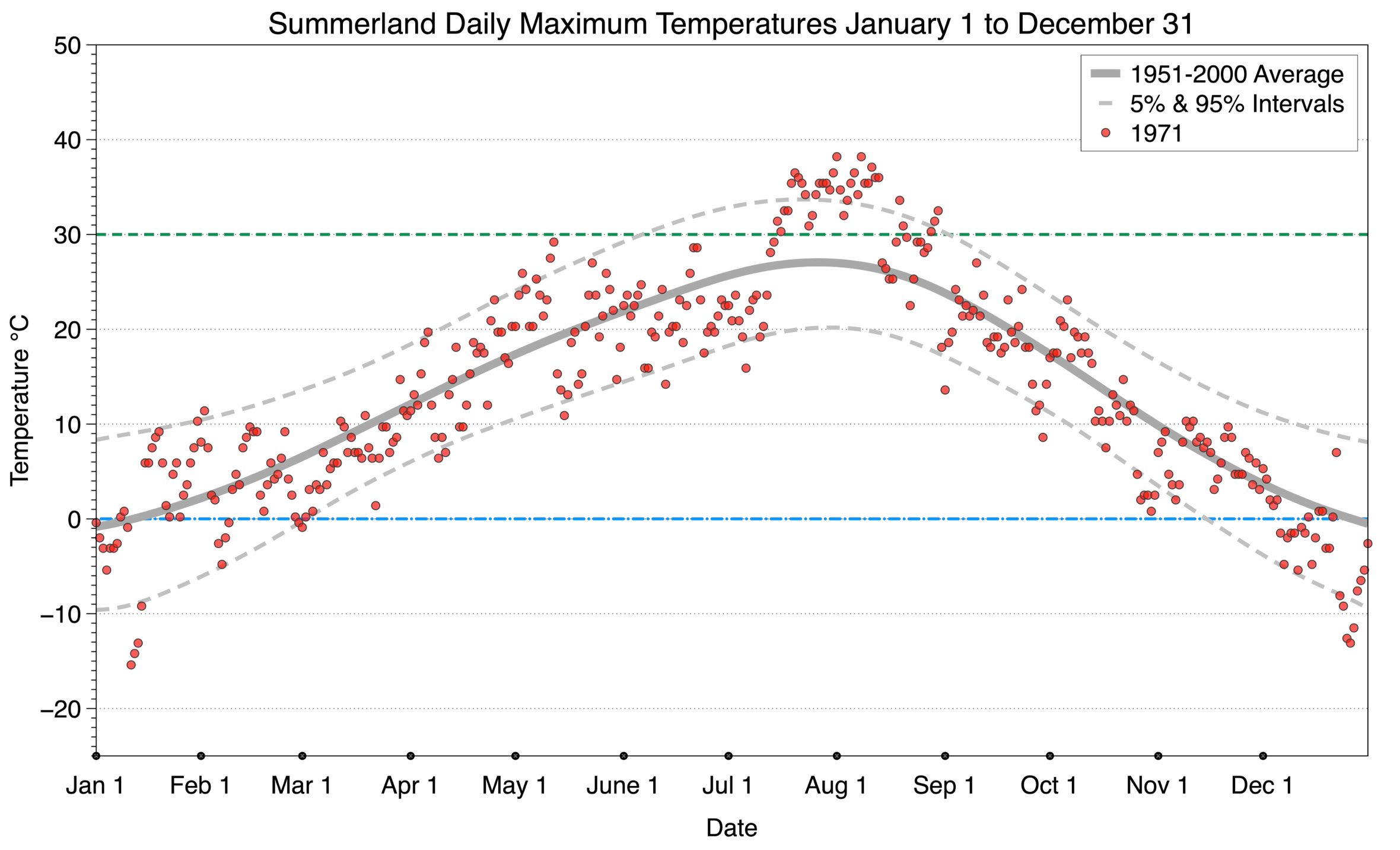 The graph below displays the day-to-day values of maximum daily temperature (red dots) at Summerland for the year 1971. On this graph, the dark grey thick center line is the average daily temperature calculated from 50 years of data from 1951 to 2000. The dotted light grey lines are the 5% and 95% probability intervals - about 90% of the data from 1951 to 2000 fell within these boundaries. Daily temperatures can be considered as extreme cold or extreme hot events if they that fall outside the 5% or 95% probability intervals, respectively. In Canada, temperatures above 30°C (green dotted line) are considered extreme daily temperatures.