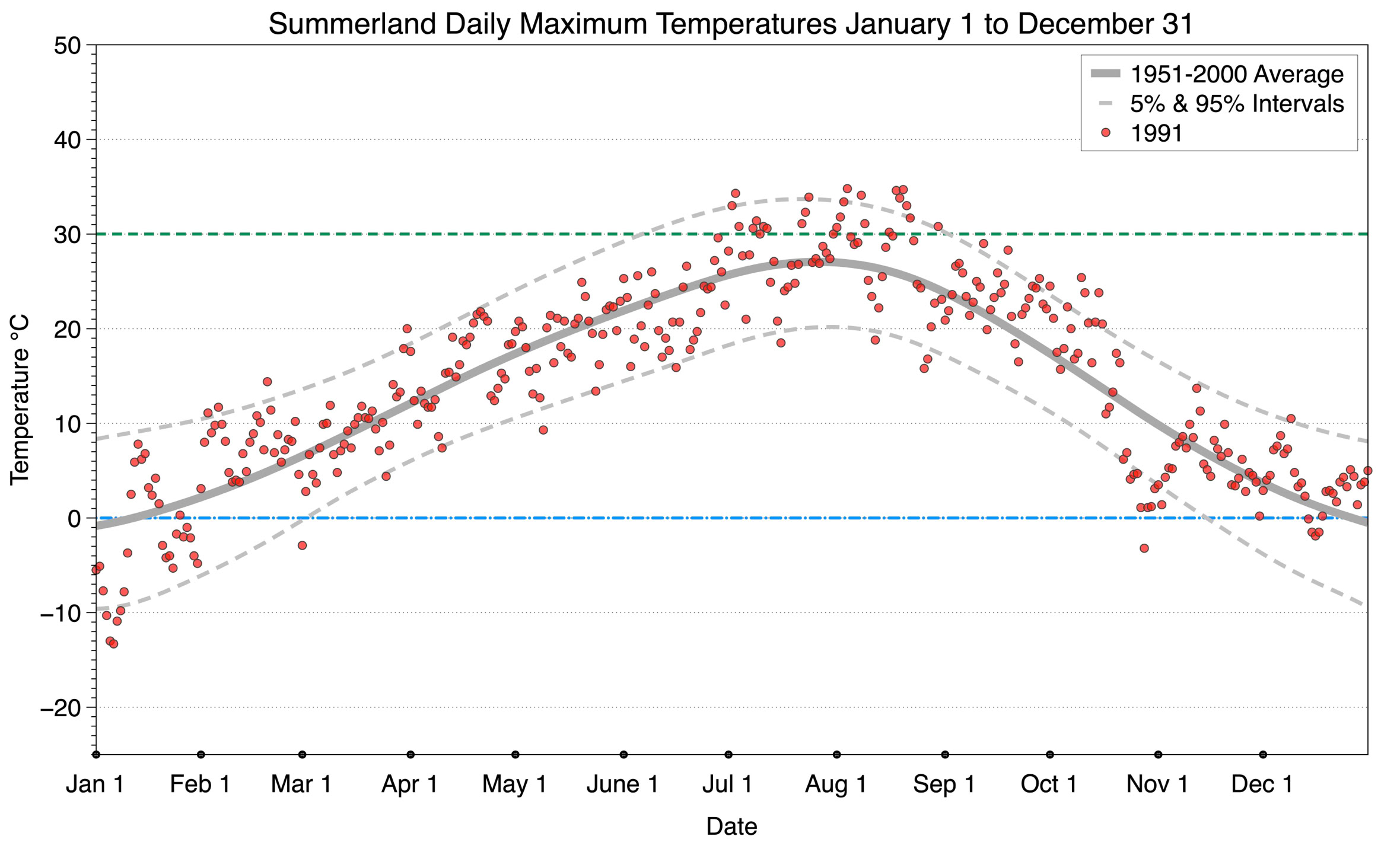 The graph below displays the day-to-day values of maximum daily temperature (red dots) at Summerland for the year 1991. On this graph, the dark grey thick center line is the average daily temperature calculated from 50 years of data from 1951 to 2000. The dotted light grey lines are the 5% and 95% probability intervals - about 90% of the data from 1951 to 2000 fell within these boundaries. Daily temperatures can be considered as extreme cold or extreme hot events if they that fall outside the 5% or 95% probability intervals, respectively. In Canada, temperatures above 30°C (green dotted line) are considered extreme daily temperatures.