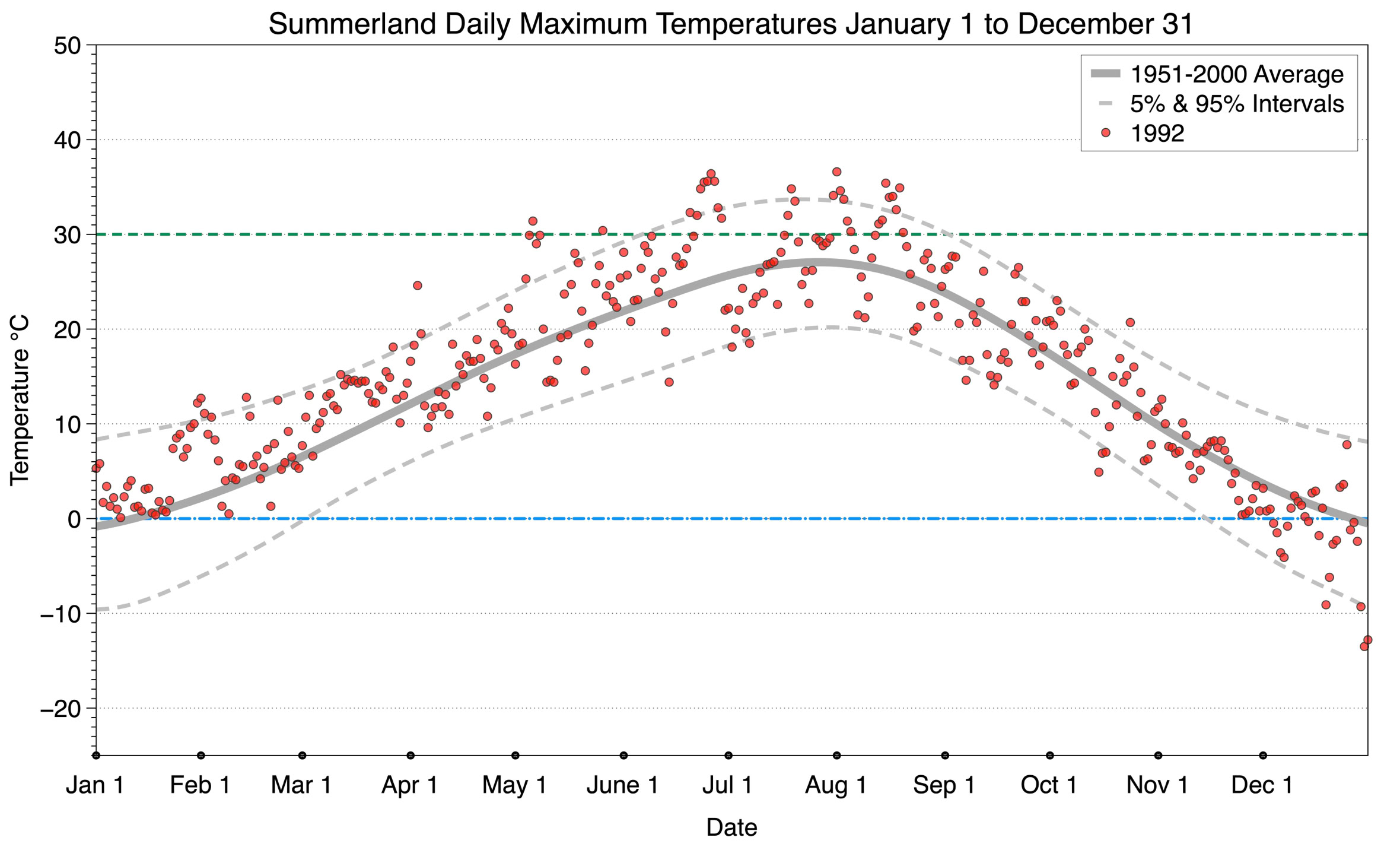 The graph below displays the day-to-day values of maximum daily temperature (red dots) at Summerland for the year 1992. On this graph, the dark grey thick center line is the average daily temperature calculated from 50 years of data from 1951 to 2000. The dotted light grey lines are the 5% and 95% probability intervals - about 90% of the data from 1951 to 2000 fell within these boundaries. Daily temperatures can be considered as extreme cold or extreme hot events if they that fall outside the 5% or 95% probability intervals, respectively. In Canada, temperatures above 30°C (green dotted line) are considered extreme daily temperatures.
