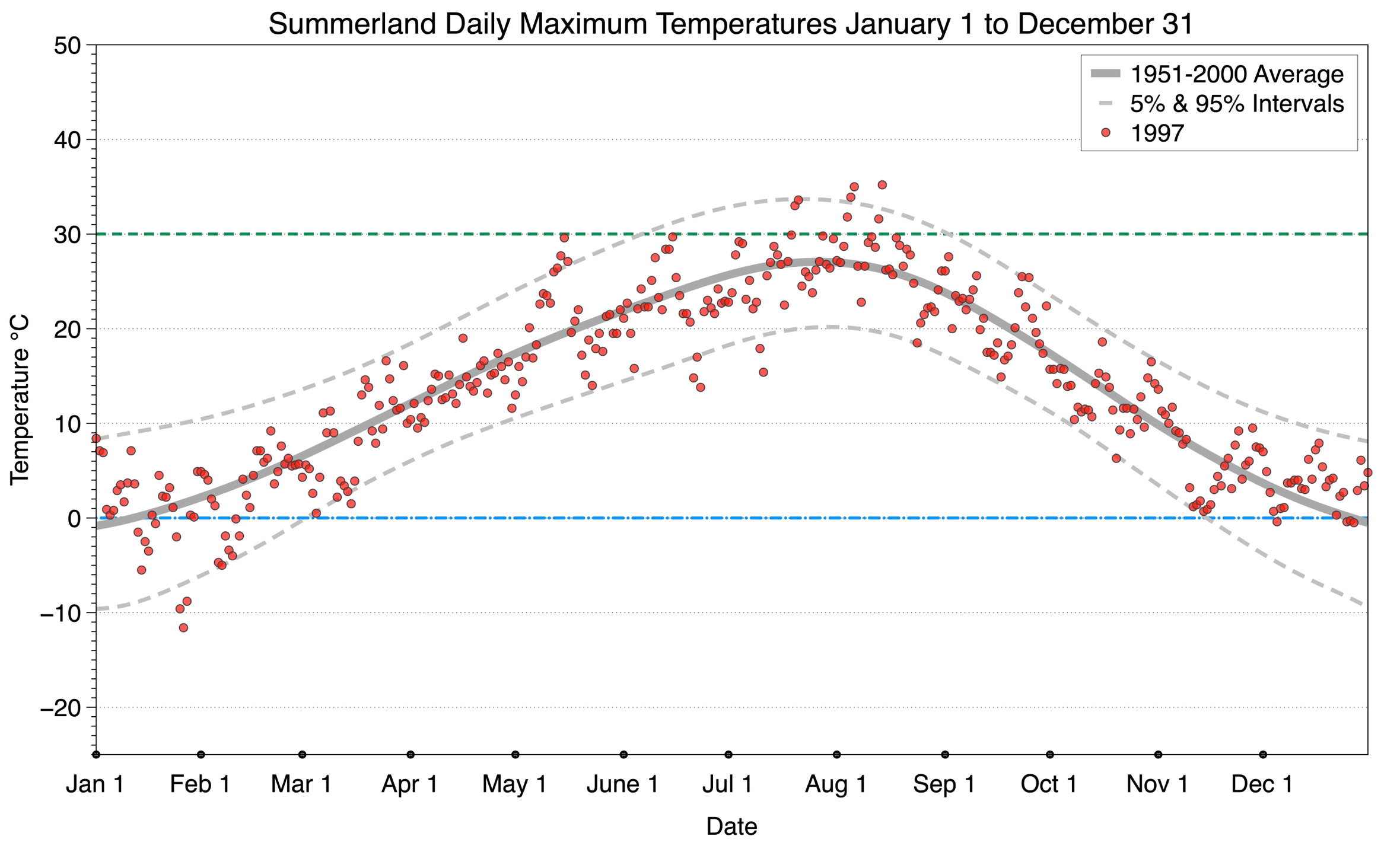 The graph below displays the day-to-day values of maximum daily temperature (red dots) at Summerland for the year 1997. On this graph, the dark grey thick center line is the average daily temperature calculated from 50 years of data from 1951 to 2000. The dotted light grey lines are the 5% and 95% probability intervals - about 90% of the data from 1951 to 2000 fell within these boundaries. Daily temperatures can be considered as extreme cold or extreme hot events if they that fall outside the 5% or 95% probability intervals, respectively. In Canada, temperatures above 30°C (green dotted line) are considered extreme daily temperatures.
