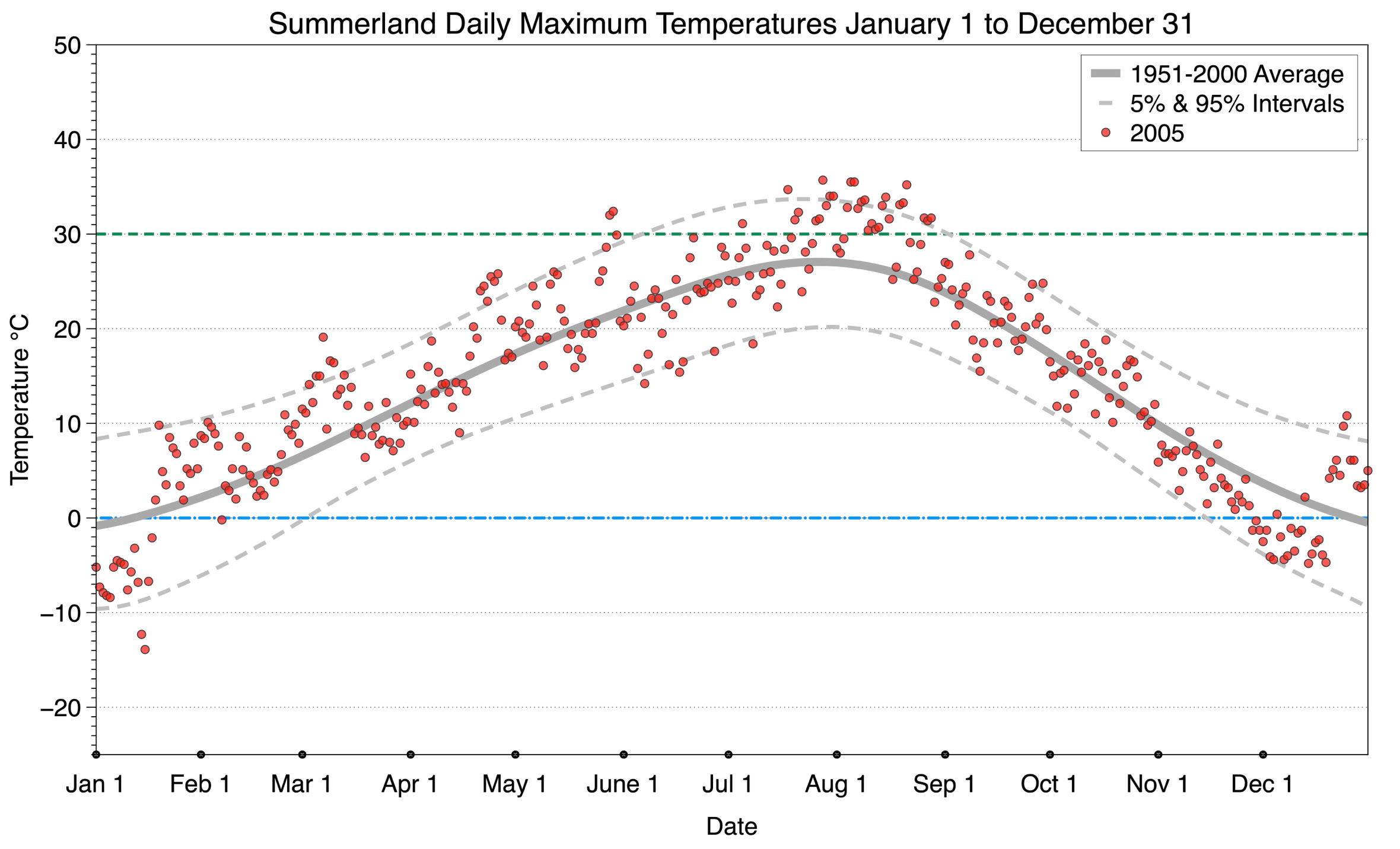 The graph below displays the day-to-day values of maximum daily temperature (red dots) at Summerland for the year 2005. On this graph, the dark grey thick center line is the average daily temperature calculated from 50 years of data from 1951 to 2000. The dotted light grey lines are the 5% and 95% probability intervals - about 90% of the data from 1951 to 2000 fell within these boundaries. Daily temperatures can be considered as extreme cold or extreme hot events if they that fall outside the 5% or 95% probability intervals, respectively. In Canada, temperatures above 30°C (green dotted line) are considered extreme daily temperatures.