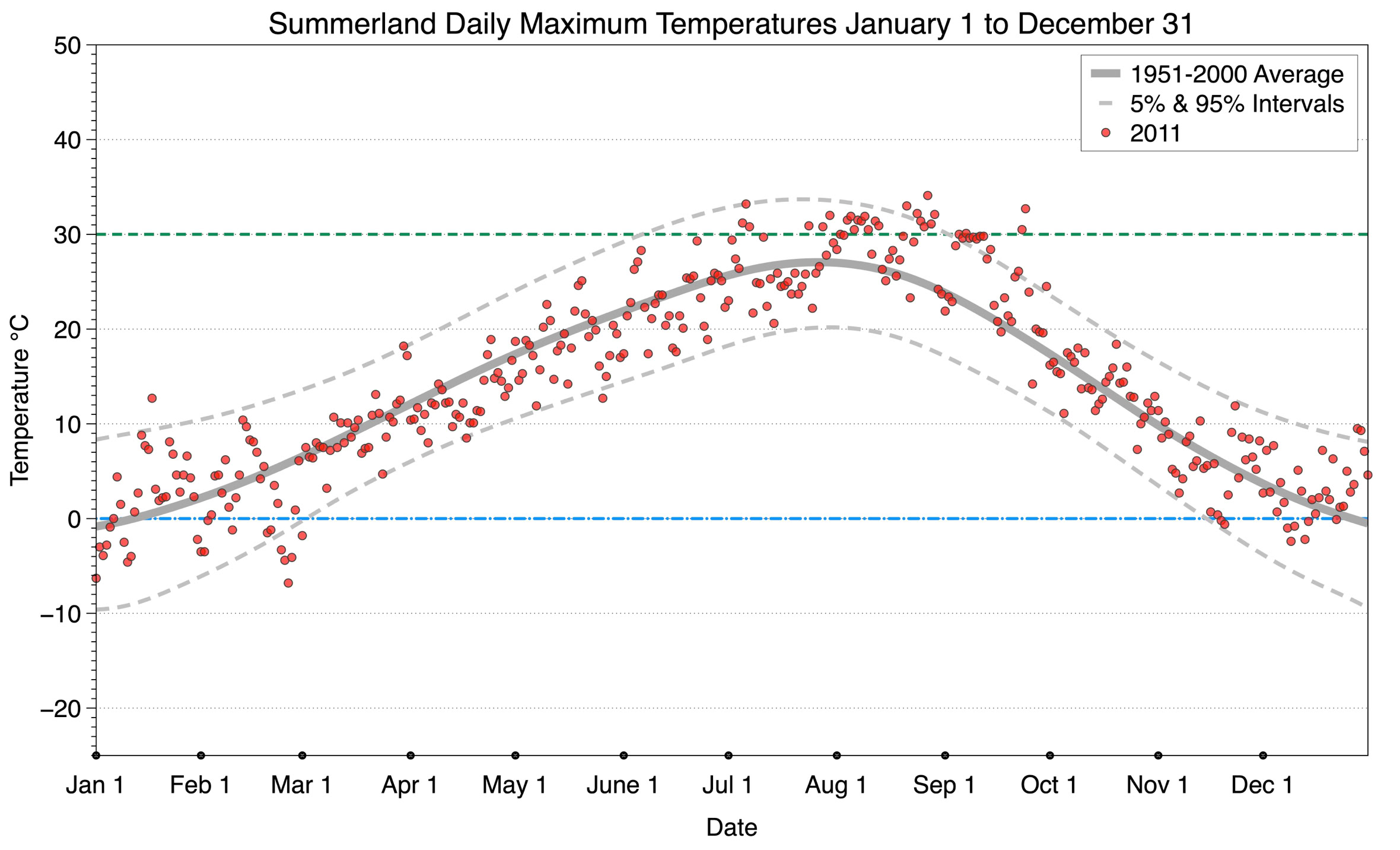 The graph below displays the day-to-day values of maximum daily temperature (red dots) at Summerland for the year 2011. On this graph, the dark grey thick center line is the average daily temperature calculated from 50 years of data from 1951 to 2000. The dotted light grey lines are the 5% and 95% probability intervals - about 90% of the data from 1951 to 2000 fell within these boundaries. Daily temperatures can be considered as extreme cold or extreme hot events if they that fall outside the 5% or 95% probability intervals, respectively. In Canada, temperatures above 30°C (green dotted line) are considered extreme daily temperatures.