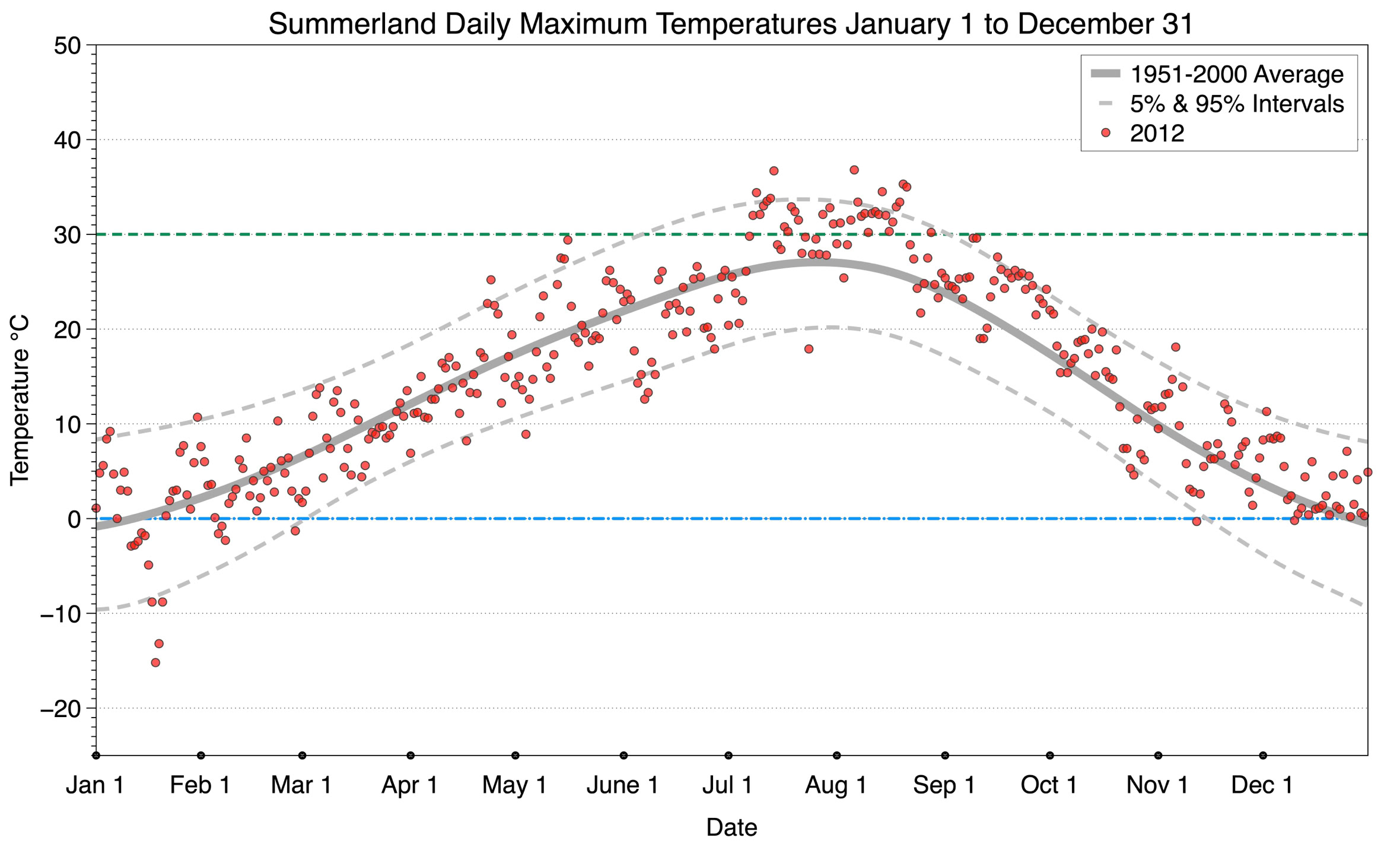 The graph below displays the day-to-day values of maximum daily temperature (red dots) at Summerland for the year 2012. On this graph, the dark grey thick center line is the average daily temperature calculated from 50 years of data from 1951 to 2000. The dotted light grey lines are the 5% and 95% probability intervals - about 90% of the data from 1951 to 2000 fell within these boundaries. Daily temperatures can be considered as extreme cold or extreme hot events if they that fall outside the 5% or 95% probability intervals, respectively. In Canada, temperatures above 30°C (green dotted line) are considered extreme daily temperatures.