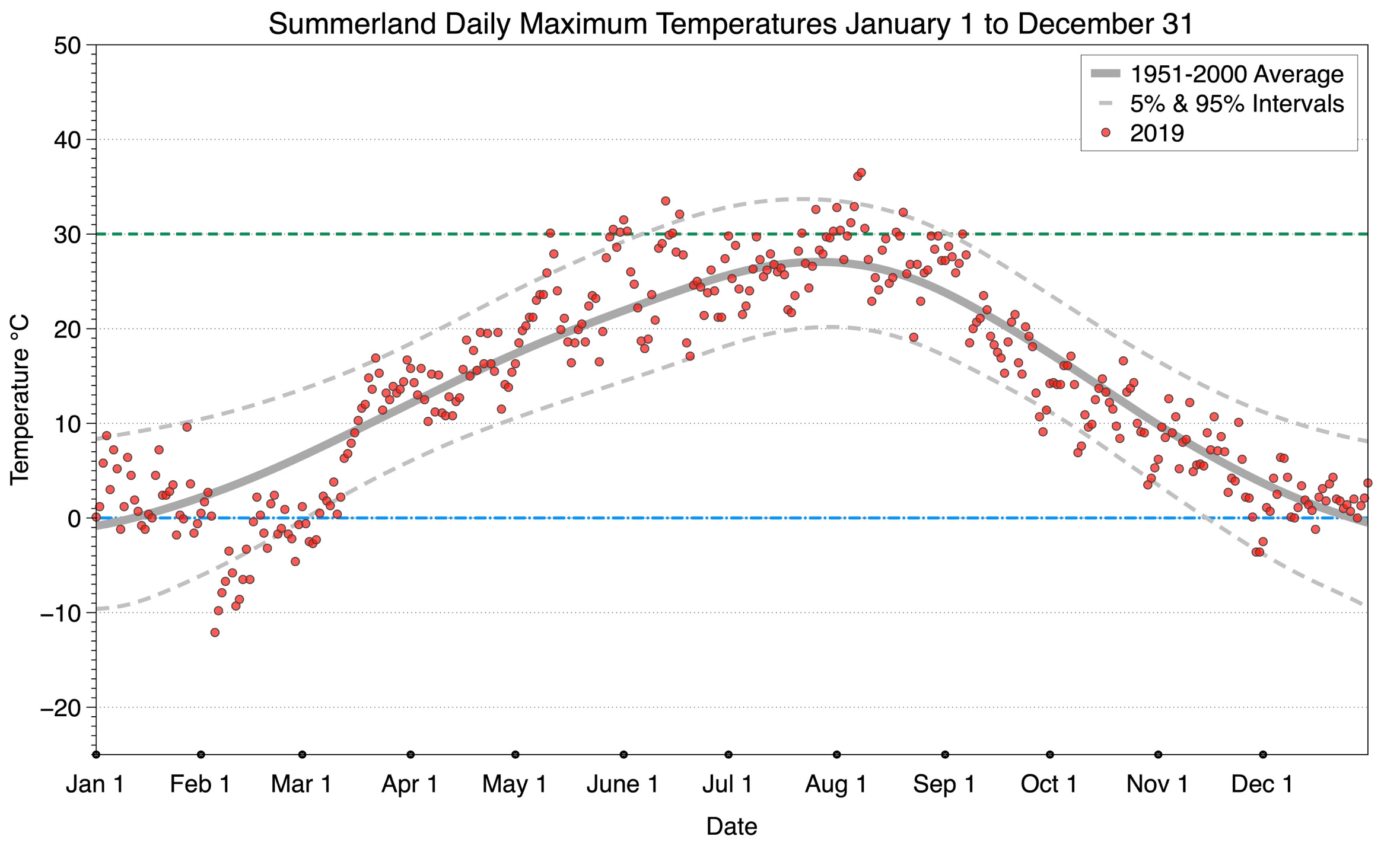 The graph below displays the day-to-day values of maximum daily temperature (red dots) at Summerland for the year 2019. On this graph, the dark grey thick center line is the average daily temperature calculated from 50 years of data from 1951 to 2000. The dotted light grey lines are the 5% and 95% probability intervals - about 90% of the data from 1951 to 2000 fell within these boundaries. Daily temperatures can be considered as extreme cold or extreme hot events if they that fall outside the 5% or 95% probability intervals, respectively. In Canada, temperatures above 30°C (green dotted line) are considered extreme daily temperatures.