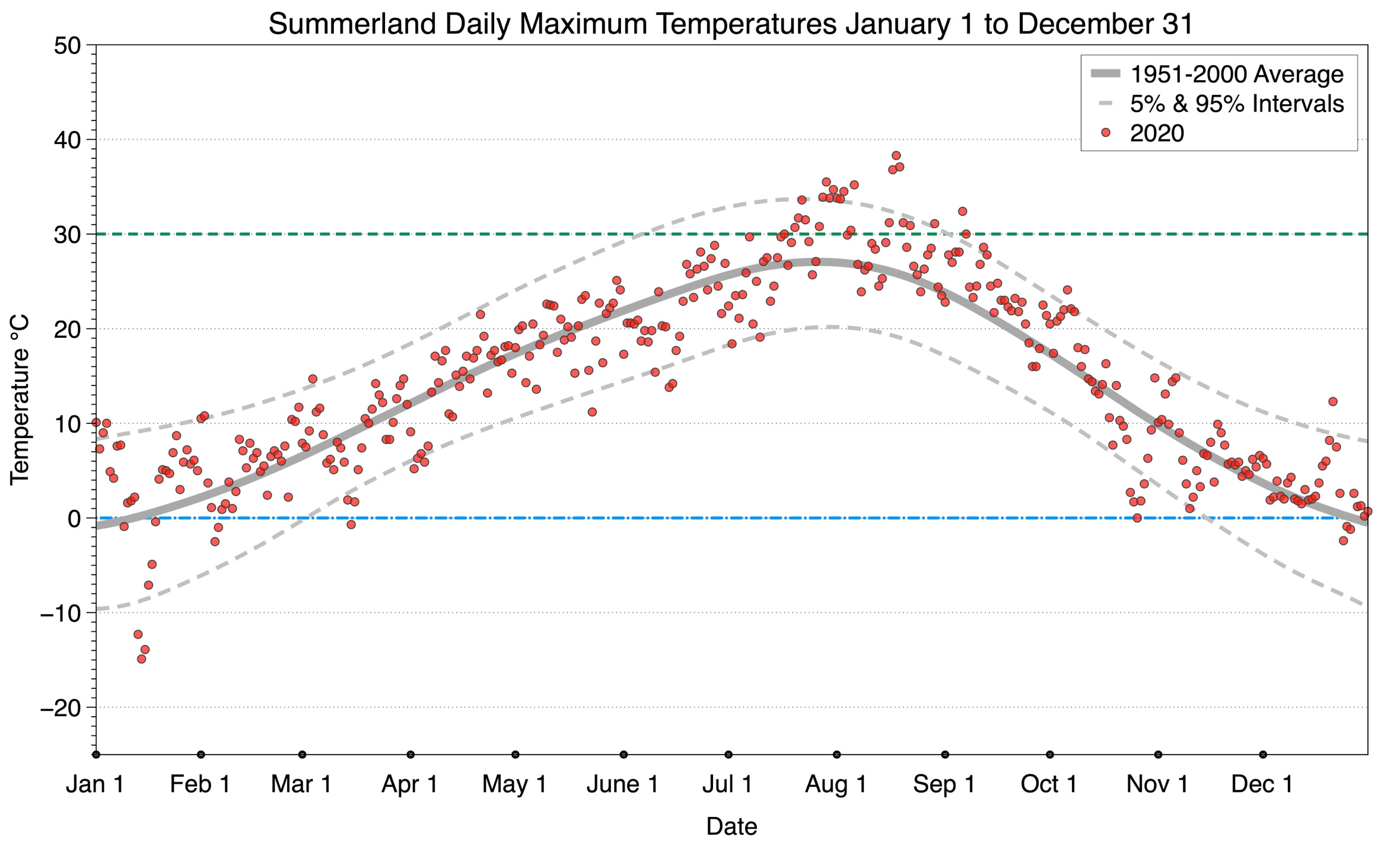 The graph below displays the day-to-day values of maximum daily temperature (red dots) at Summerland for the year 2020. On this graph, the dark grey thick center line is the average daily temperature calculated from 50 years of data from 1951 to 2000. The dotted light grey lines are the 5% and 95% probability intervals - about 90% of the data from 1951 to 2000 fell within these boundaries. Daily temperatures can be considered as extreme cold or extreme hot events if they that fall outside the 5% or 95% probability intervals, respectively. In Canada, temperatures above 30°C (green dotted line) are considered extreme daily temperatures.