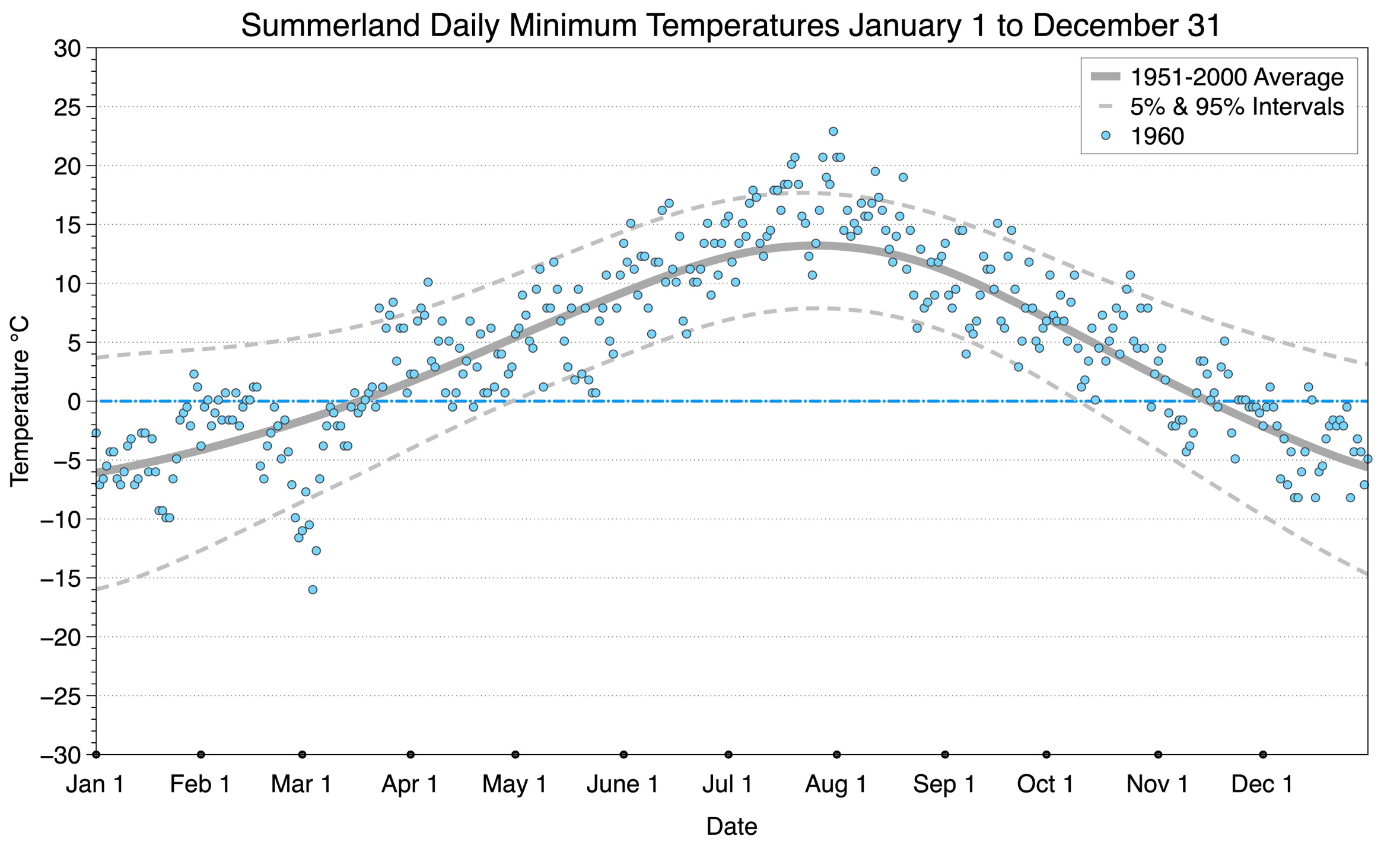 The graph below displays the day-to-day values of minimum daily temperature (blue dots) at Summerland for the year 1960. On this graph, the dark grey thick center line is the average daily temperature calculated from 50 years of data from 1951 to 2000. The dotted light grey lines are the 5% and 95% probability intervals - about 90% of the data from 1951 to 2000 fell within these boundaries. Daily temperatures can be considered as extreme cold or extreme hot events if they that fall outside the 5% or 95% probability intervals, respectively.