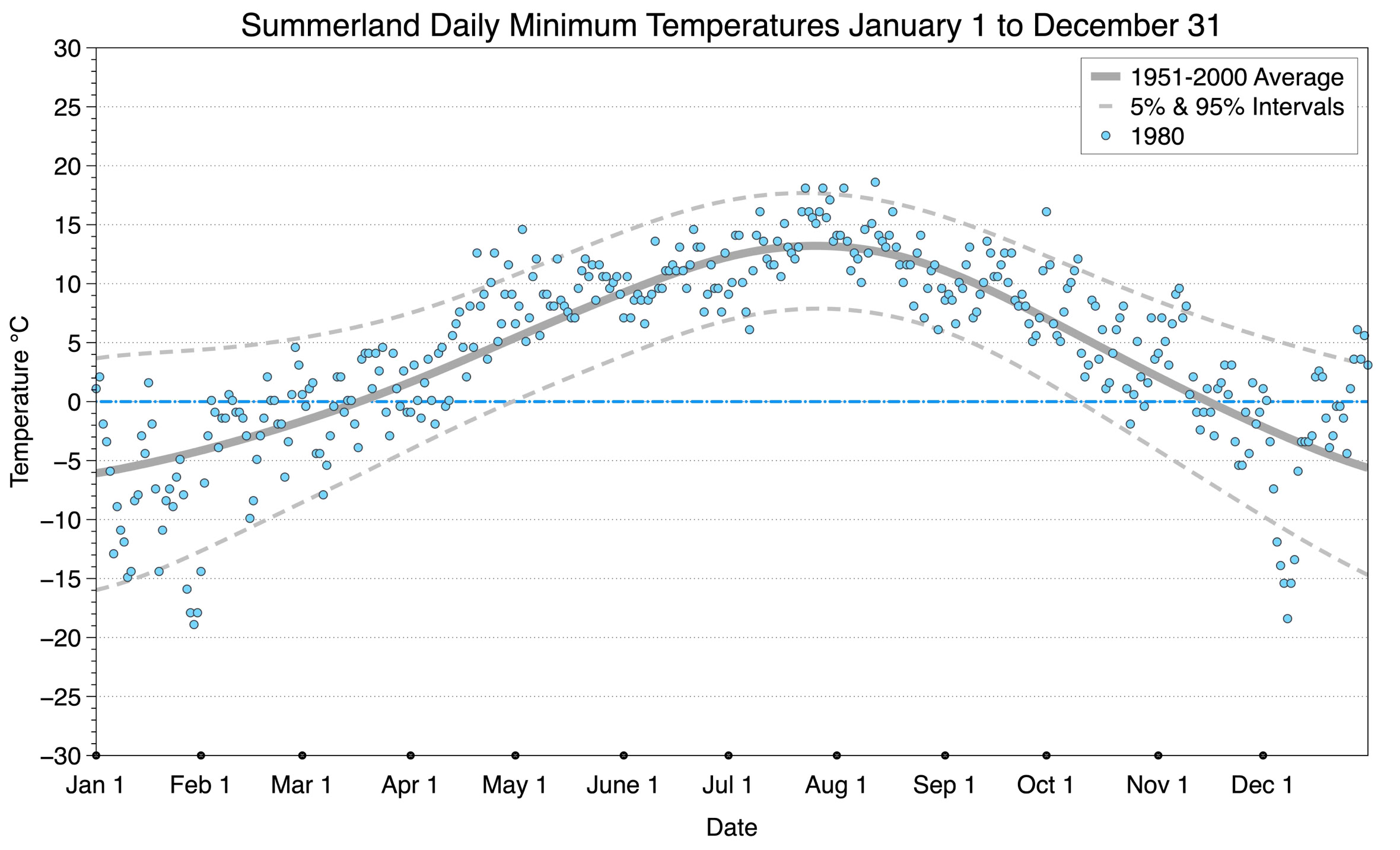 The graph below displays the day-to-day values of minimum daily temperature (blue dots) at Summerland for the year 1980. On this graph, the dark grey thick center line is the average daily temperature calculated from 50 years of data from 1951 to 2000. The dotted light grey lines are the 5% and 95% probability intervals - about 90% of the data from 1951 to 2000 fell within these boundaries. Daily temperatures can be considered as extreme cold or extreme hot events if they that fall outside the 5% or 95% probability intervals, respectively.
