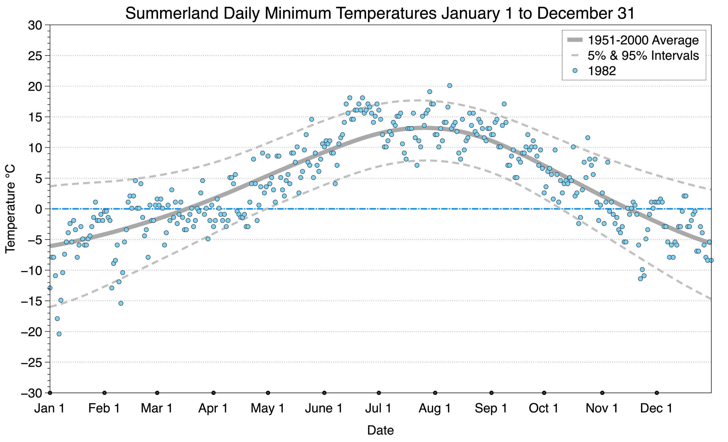 The graph below displays the day-to-day values of minimum daily temperature (blue dots) at Summerland for the year 1982. On this graph, the dark grey thick center line is the average daily temperature calculated from 50 years of data from 1951 to 2000. The dotted light grey lines are the 5% and 95% probability intervals - about 90% of the data from 1951 to 2000 fell within these boundaries. Daily temperatures can be considered as extreme cold or extreme hot events if they that fall outside the 5% or 95% probability intervals, respectively.