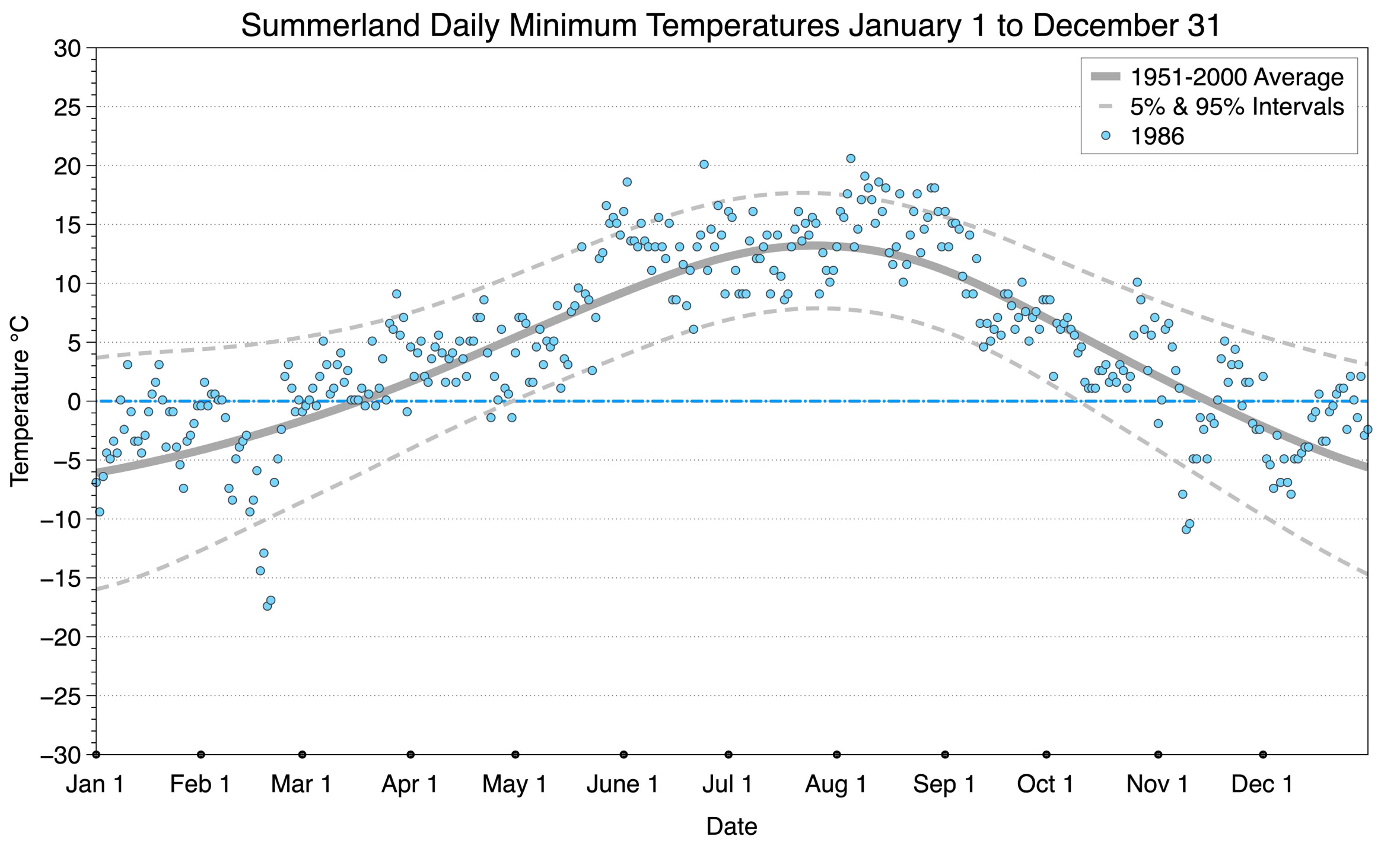 The graph below displays the day-to-day values of minimum daily temperature (blue dots) at Summerland for the year 1986. On this graph, the dark grey thick center line is the average daily temperature calculated from 50 years of data from 1951 to 2000. The dotted light grey lines are the 5% and 95% probability intervals - about 90% of the data from 1951 to 2000 fell within these boundaries. Daily temperatures can be considered as extreme cold or extreme hot events if they that fall outside the 5% or 95% probability intervals, respectively.