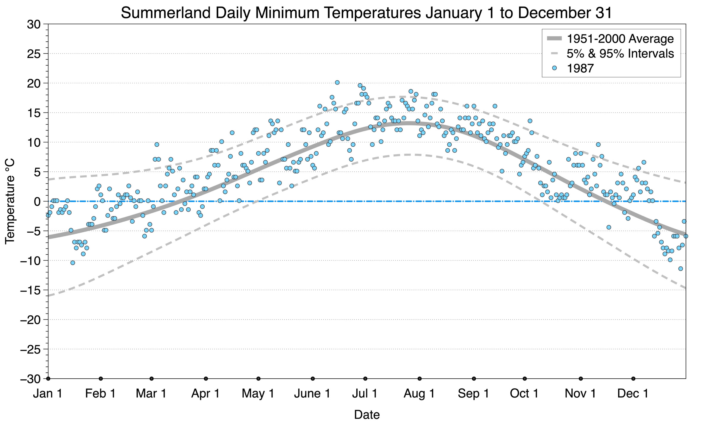 The graph below displays the day-to-day values of minimum daily temperature (blue dots) at Summerland for the year 1987. On this graph, the dark grey thick center line is the average daily temperature calculated from 50 years of data from 1951 to 2000. The dotted light grey lines are the 5% and 95% probability intervals - about 90% of the data from 1951 to 2000 fell within these boundaries. Daily temperatures can be considered as extreme cold or extreme hot events if they that fall outside the 5% or 95% probability intervals, respectively.