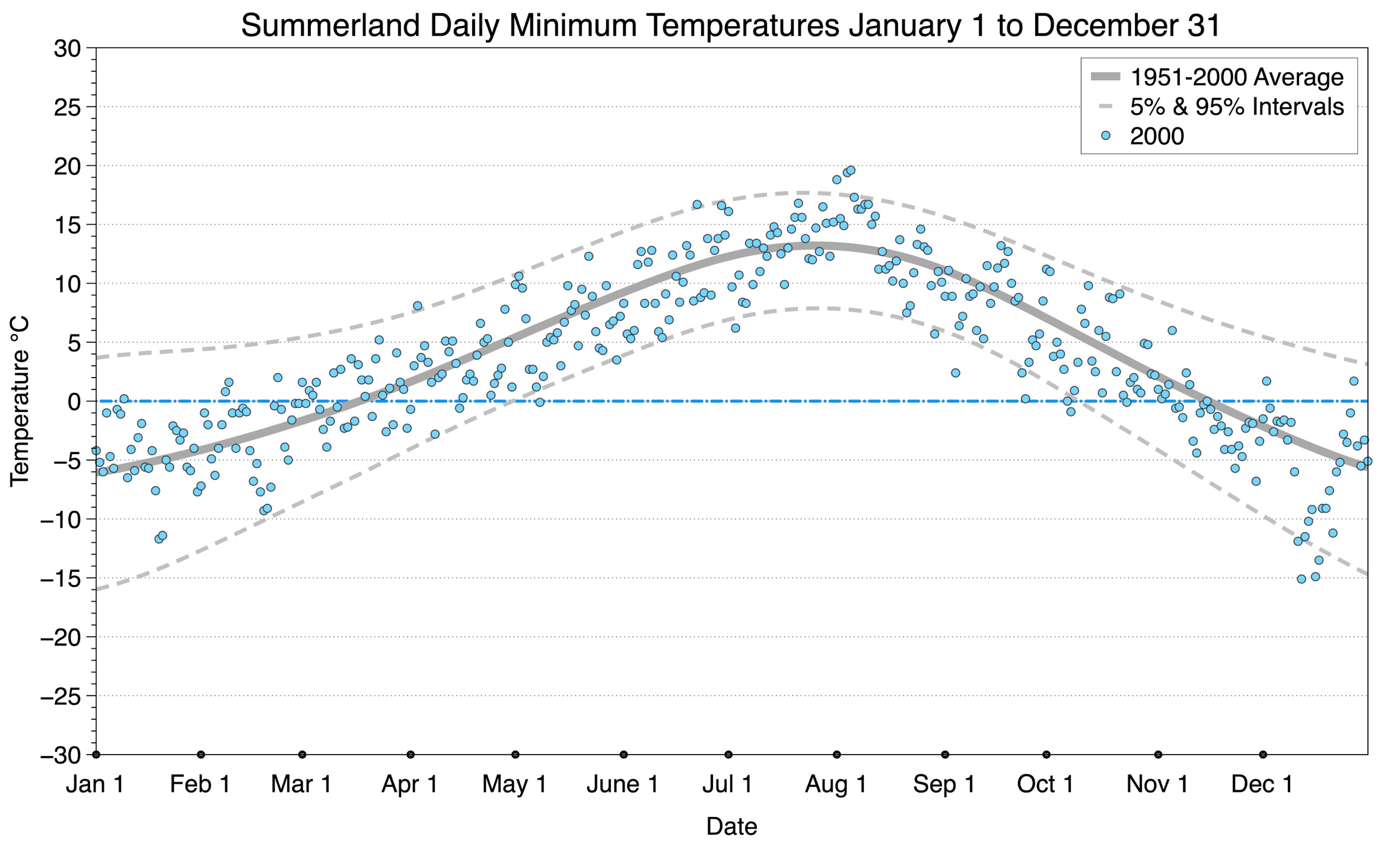The graph below displays the day-to-day values of minimum daily temperature (blue dots) at Summerland for the year 2000. On this graph, the dark grey thick center line is the average daily temperature calculated from 50 years of data from 1951 to 2000. The dotted light grey lines are the 5% and 95% probability intervals - about 90% of the data from 1951 to 2000 fell within these boundaries. Daily temperatures can be considered as extreme cold or extreme hot events if they that fall outside the 5% or 95% probability intervals, respectively.