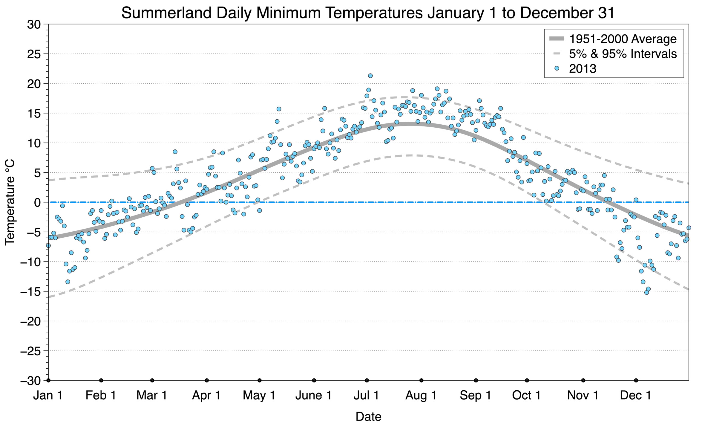 The graph below displays the day-to-day values of minimum daily temperature (blue dots) at Summerland for the year 2013. On this graph, the dark grey thick center line is the average daily temperature calculated from 50 years of data from 1951 to 2000. The dotted light grey lines are the 5% and 95% probability intervals - about 90% of the data from 1951 to 2000 fell within these boundaries. Daily temperatures can be considered as extreme cold or extreme hot events if they that fall outside the 5% or 95% probability intervals, respectively.