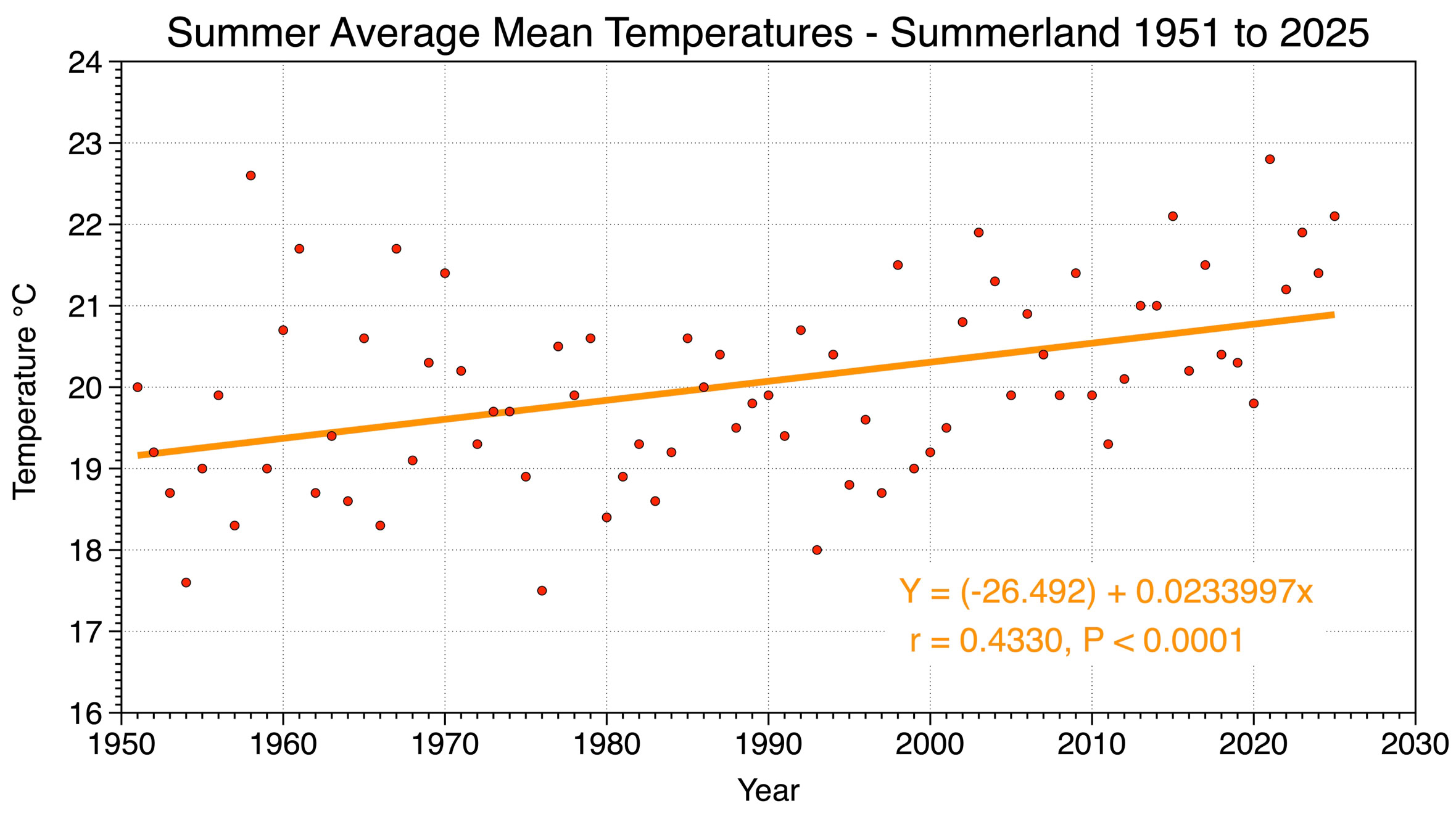 Figure 6 Summerland’s summer average mean temperatures from 1951 to 2025. Summer average mean temperature has been steadily increasing at a rate of 0.23°C per decade according to linear regression analysis.