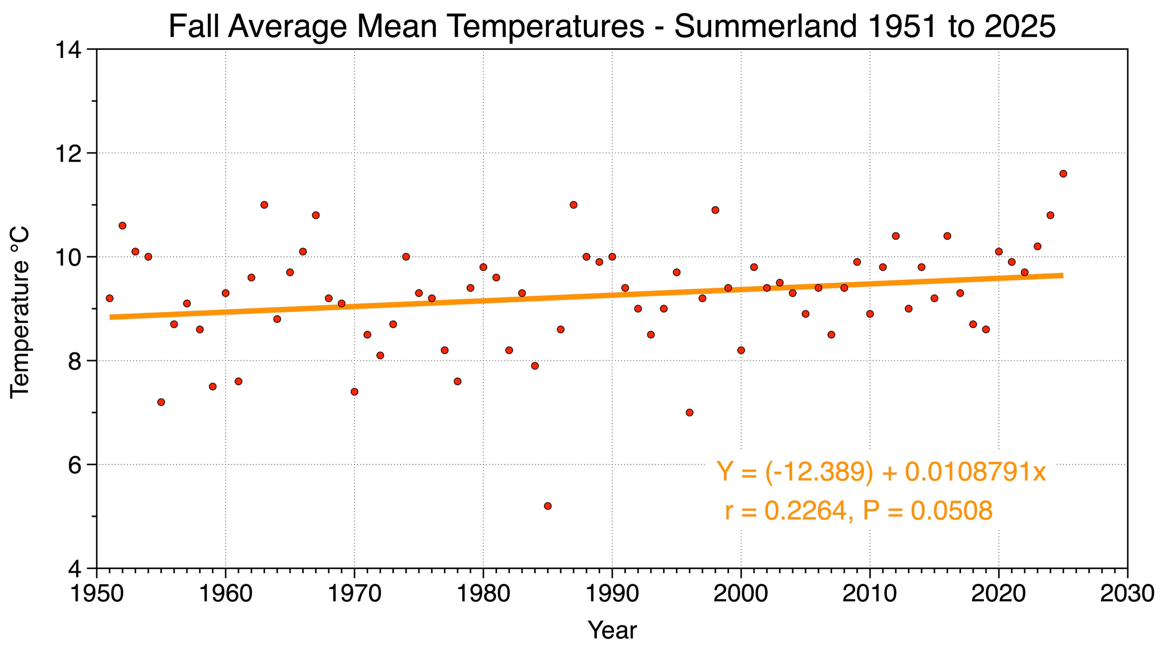Figure 7 Summerland’s fall average mean temperatures from 1951 to 2025. Fall average mean temperature has been steadily increasing at a rate of 0.11°C per decade according to linear regression analysis.