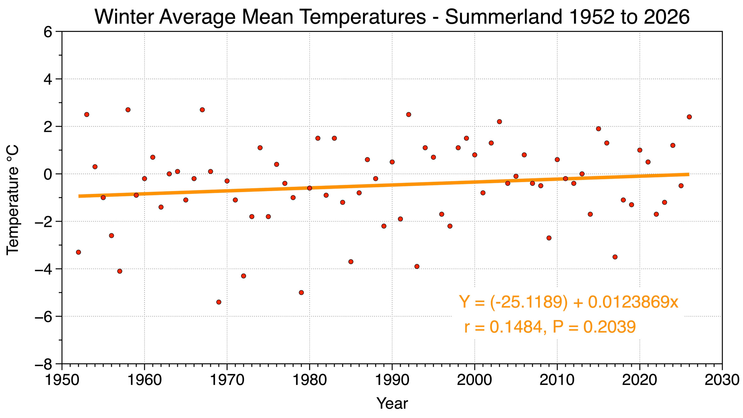 Figure 8 Summerland’s winter average mean temperatures from 1952 to 2026. Winter average mean temperature has been steadily increasing at a rate of 0.12°C per decade according to linear regression analysis.