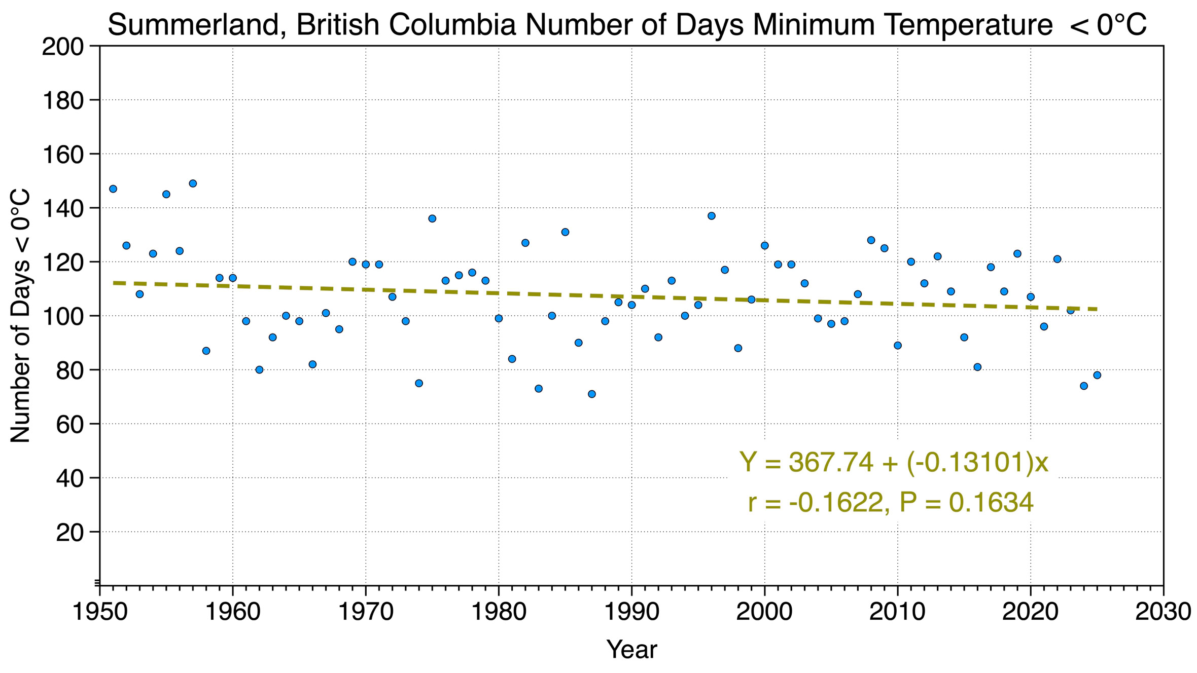 Figure 12 Yearly number of minumum daily temperature events < 0°C from 1951 to 2025 in Summerland. Minimum daily temperature events < 0°C have been steadily decreasing at a rate of about 1.3 days per decade according to linear regression analysis.