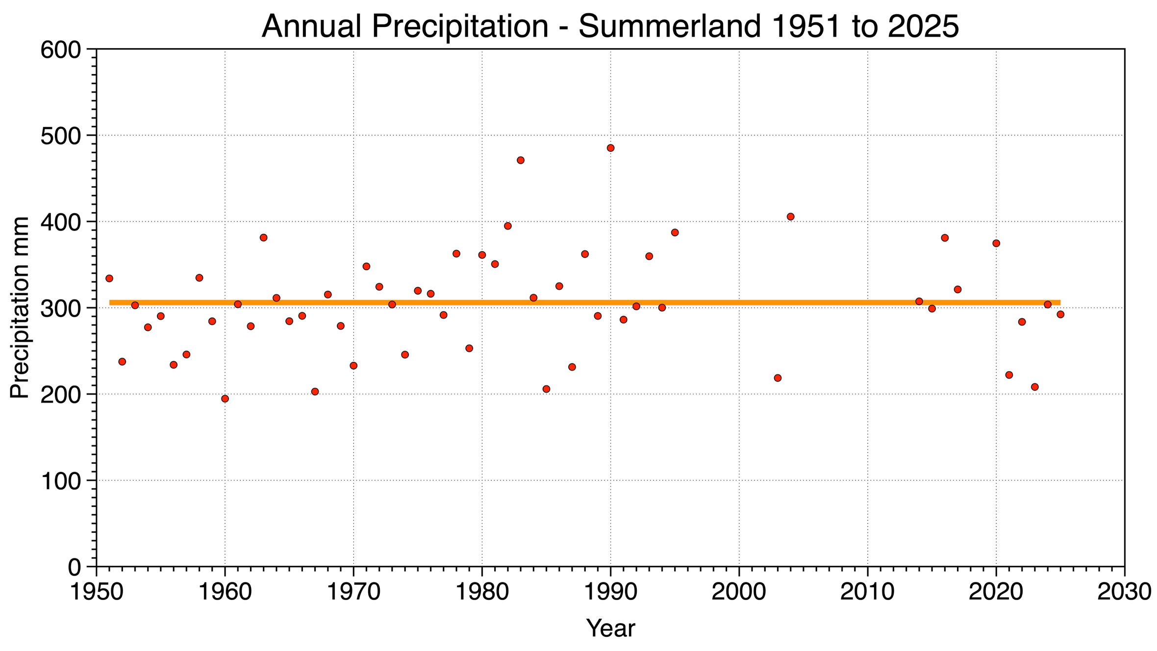 Figure 4 Summerland’s annual precipitation from 1951 to 2025. The orange line shows the average annual precipiation (306 mm) for the years that were plotted.