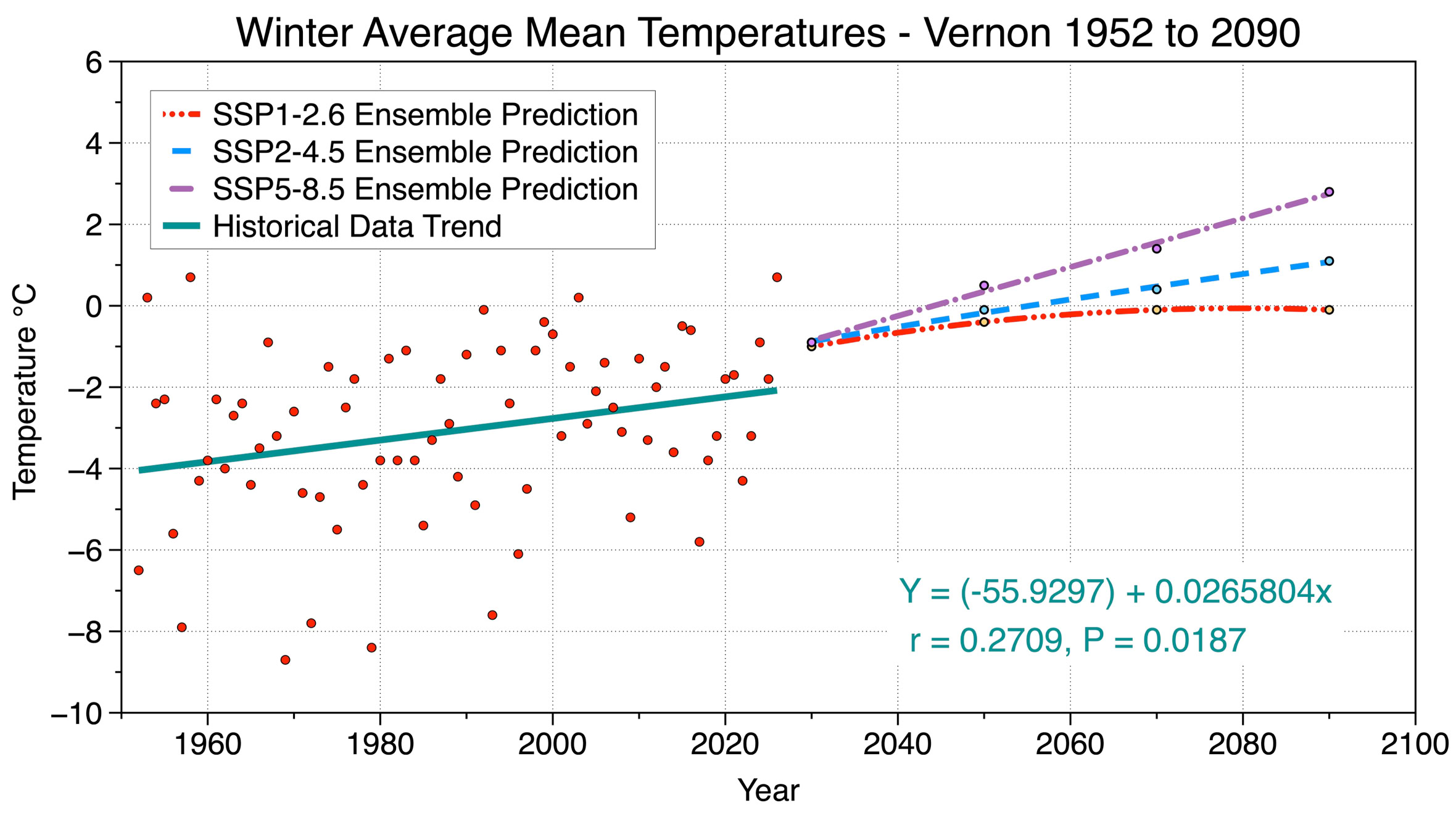 Figure 6 Eight-model ensemble forecasted changes in Vernon’s winter average mean temperature under SSP1-2.6, SSP2-4.5, and SSP5-8.5 emission scenarios from 2030 to 2090. Also shown is the historical measurements of winter average mean temperature from 1952 to 2026, and a best-fit linear regression line (teal colored) describing the average change in this climate variable during this period.