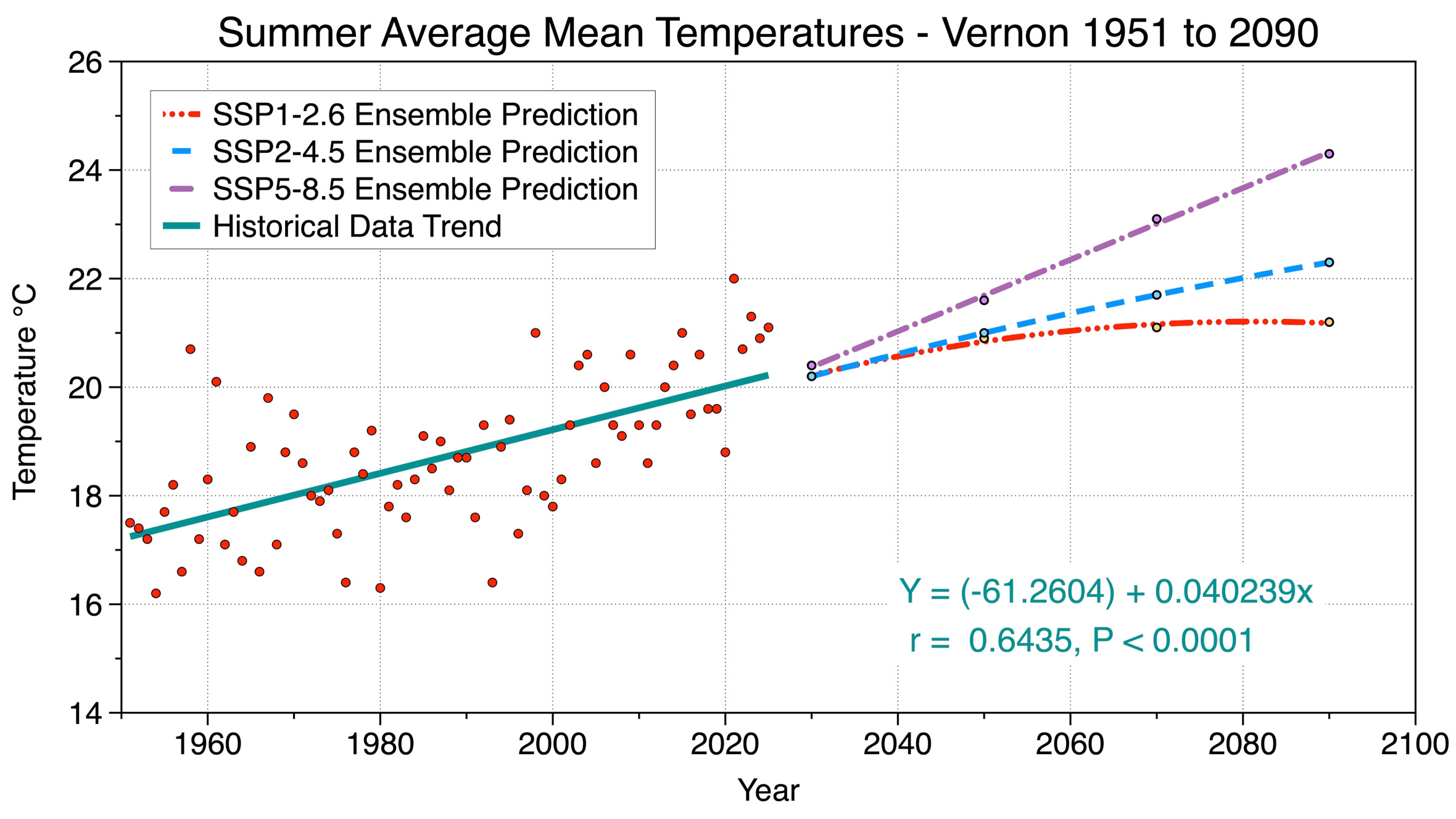 Figure 4 Eight-model ensemble forecasted changes in Vernon’s summer average mean temperature under SSP1-2.6, SSP2-4.5, and SSP5-8.5 emission scenarios from 2030 to 2090. Also shown is the historical measurements of summer average mean temperature from 1951-2025, and a best-fit linear regression line (teal colored) describing the average change in this climate variable during this period.