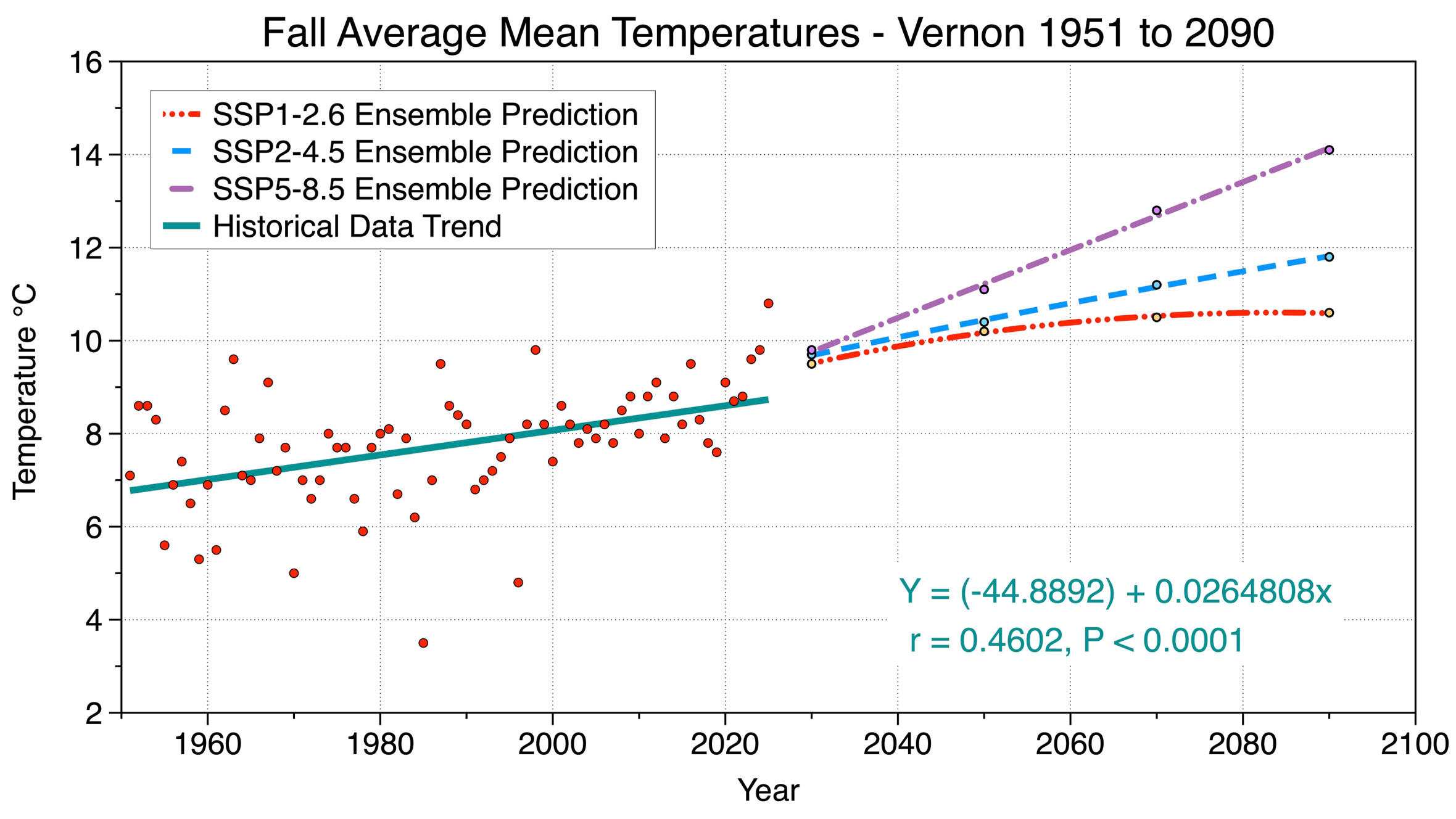 Figure 5 Eight-model ensemble forecasted changes in Vernon’s fall average mean temperature under SSP1-2.6, SSP2-4.5, and SSP5-8.5 emission scenarios from 2030 to 2090. Also shown is the historical measurements of fall average mean temperature from 1951-2025, and a best-fit linear regression line (teal colored) describing the average change in this climate variable during this period.