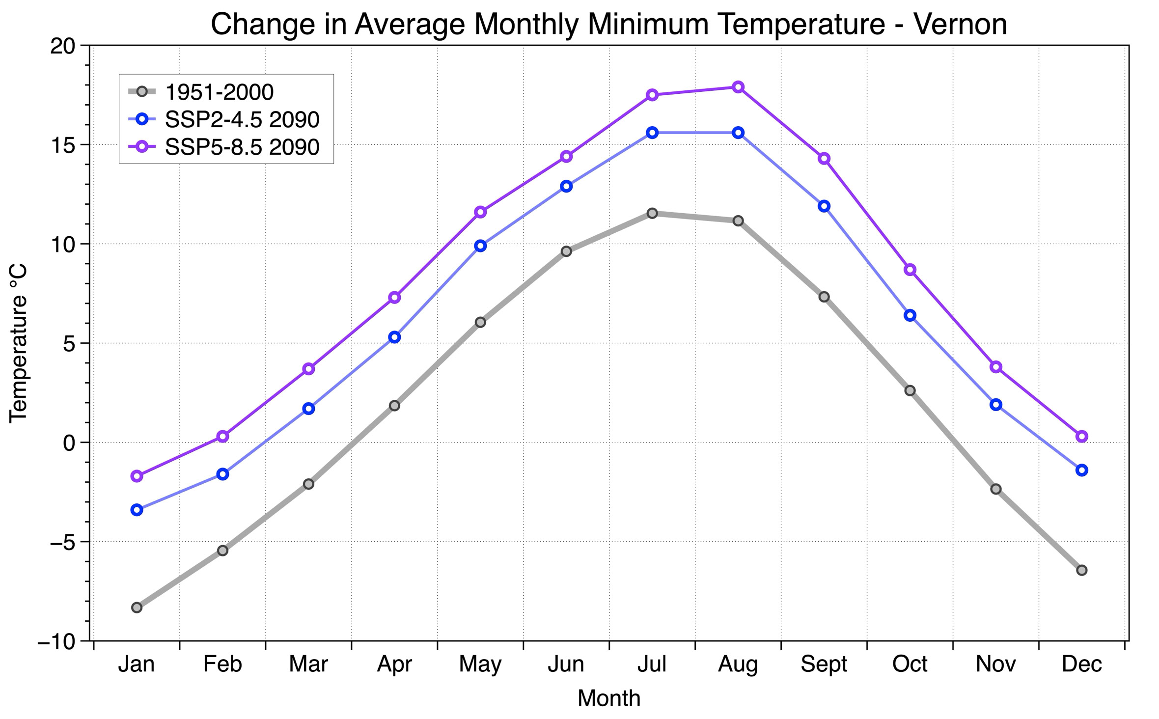 Figure 8 Future change in average monthly minimum temperatures at Vernon from 1951-2000 to 2090 for the SSP2-4.5 and SSP5-8.5 greenhouse gas emission scenarios.