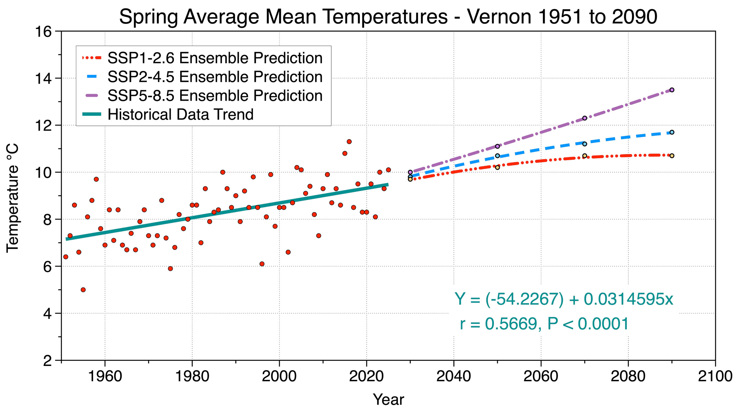 Figure 3 Eight-model ensemble forecasted changes in Vernon’s spring average mean temperature under SSP1-2.6, SSP2-4.5, and SSP5-8.5 emission scenarios from 2030 to 2090. Also shown is the historical measurements of spring average mean temperature from 1951-2025, and a best-fit linear regression line (teal colored) describing the average change in this climate variable during this period.
