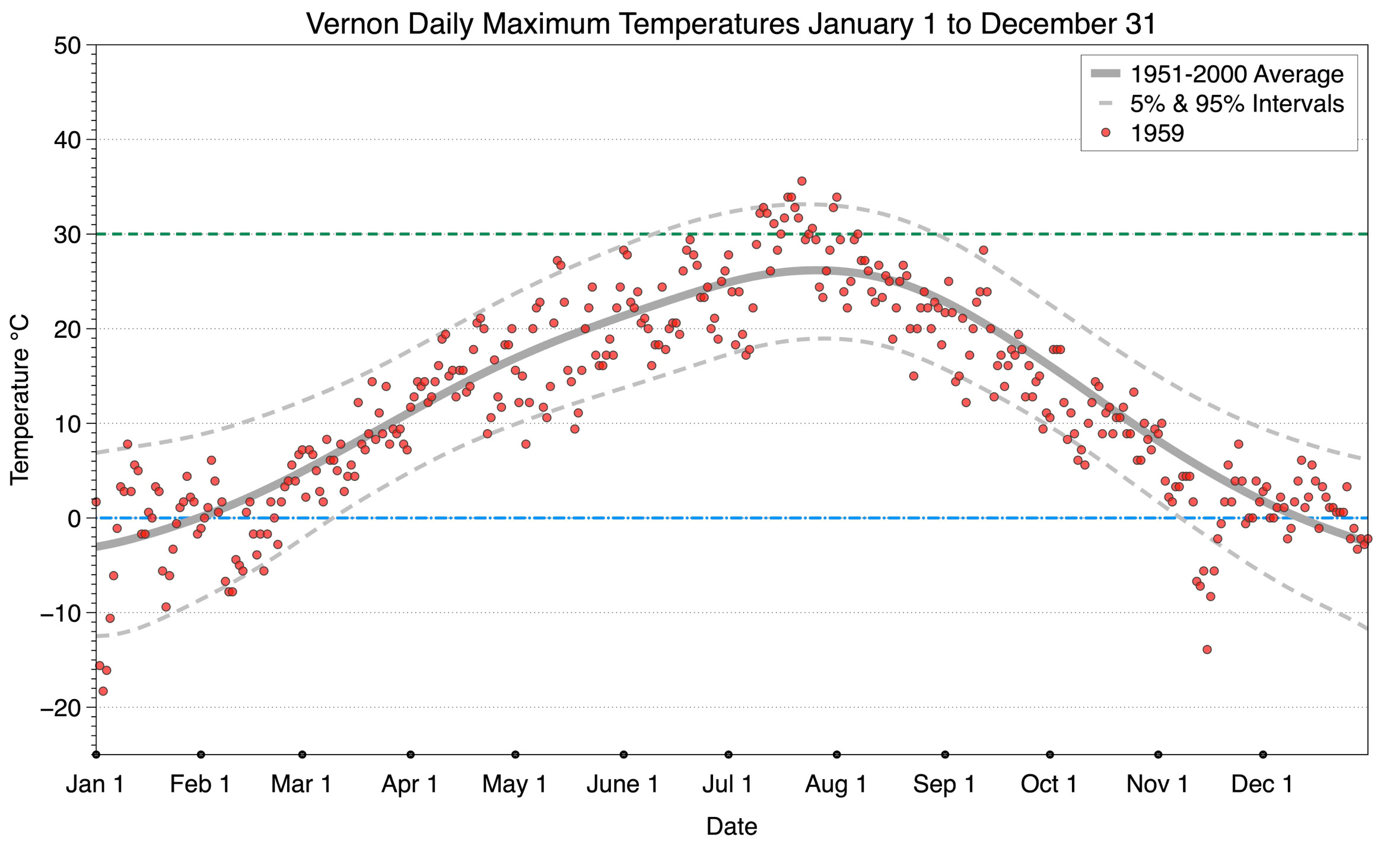 The graph below displays the day-to-day values of maximum daily temperature (red dots) at Vernon for the year 1959. On this graph, the dark grey thick center line is the average daily temperature calculated from 50 years of data from 1951 to 2000. The dotted light grey lines are the 5% and 95% probability intervals - about 90% of the data from 1951 to 2000 fell within these boundaries. Daily temperatures can be considered as extreme cold or extreme hot events if they that fall outside the 5% or 95% probability intervals, respectively. In Canada, temperatures above 30°C (green dotted line) are considered extreme daily temperatures.