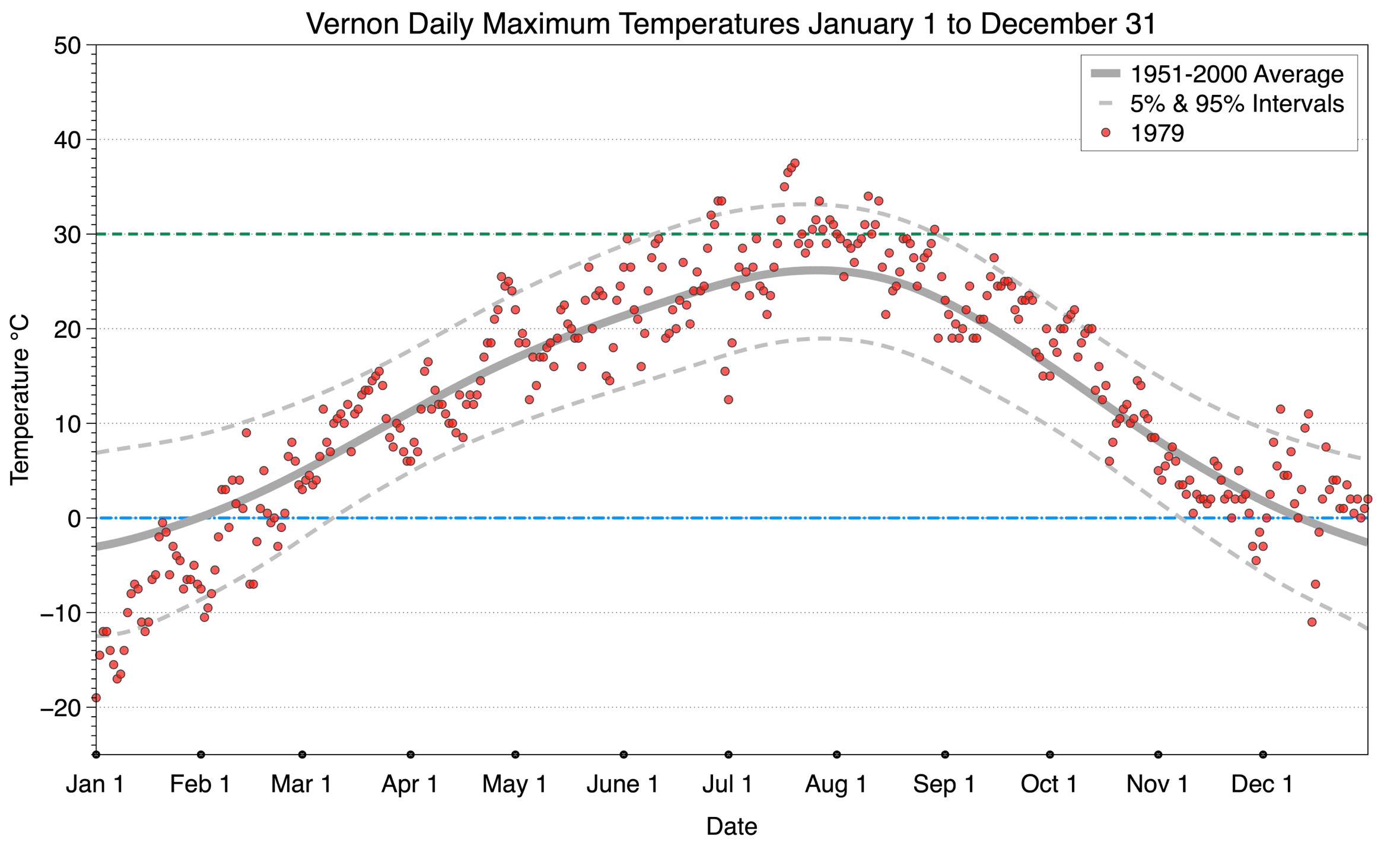 The graph below displays the day-to-day values of maximum daily temperature (red dots) at Vernon for the year 1979. On this graph, the dark grey thick center line is the average daily temperature calculated from 50 years of data from 1951 to 2000. The dotted light grey lines are the 5% and 95% probability intervals - about 90% of the data from 1951 to 2000 fell within these boundaries. Daily temperatures can be considered as extreme cold or extreme hot events if they that fall outside the 5% or 95% probability intervals, respectively. In Canada, temperatures above 30°C (green dotted line) are considered extreme daily temperatures.