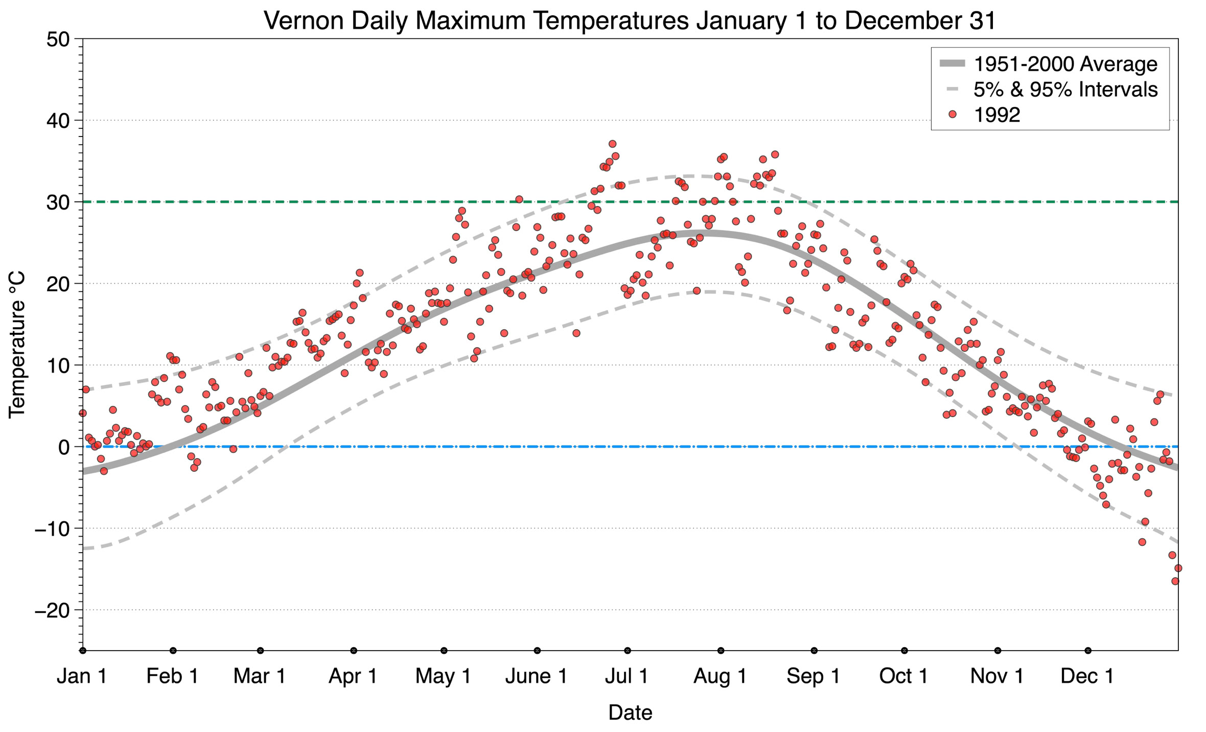 The graph below displays the day-to-day values of maximum daily temperature (red dots) at Vernon for the year 1992. On this graph, the dark grey thick center line is the average daily temperature calculated from 50 years of data from 1951 to 2000. The dotted light grey lines are the 5% and 95% probability intervals - about 90% of the data from 1951 to 2000 fell within these boundaries. Daily temperatures can be considered as extreme cold or extreme hot events if they that fall outside the 5% or 95% probability intervals, respectively. In Canada, temperatures above 30°C (green dotted line) are considered extreme daily temperatures.