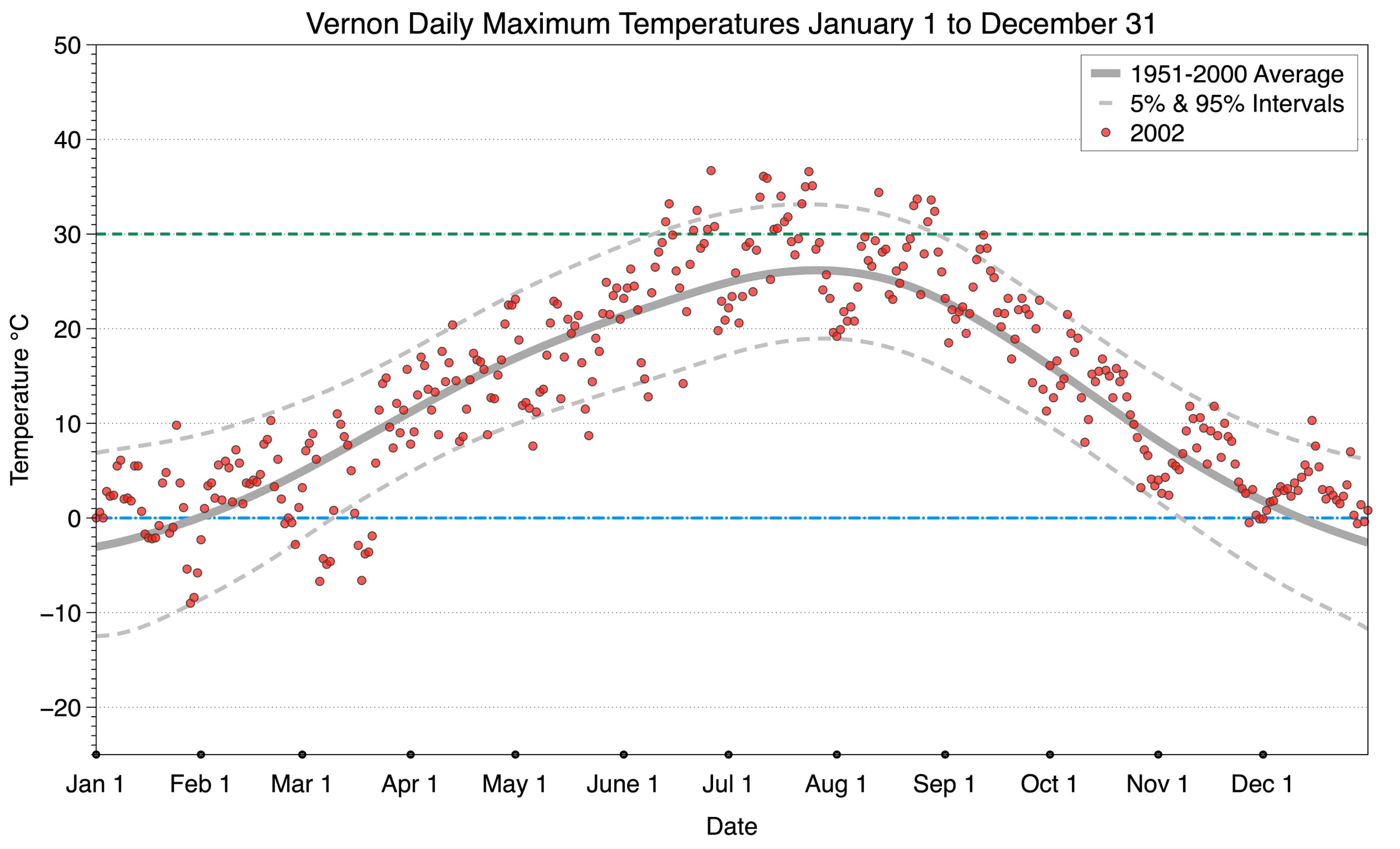 The graph below displays the day-to-day values of maximum daily temperature (red dots) at Vernon for the year 2002. On this graph, the dark grey thick center line is the average daily temperature calculated from 50 years of data from 1951 to 2000. The dotted light grey lines are the 5% and 95% probability intervals - about 90% of the data from 1951 to 2000 fell within these boundaries. Daily temperatures can be considered as extreme cold or extreme hot events if they that fall outside the 5% or 95% probability intervals, respectively. In Canada, temperatures above 30°C (green dotted line) are considered extreme daily temperatures.
