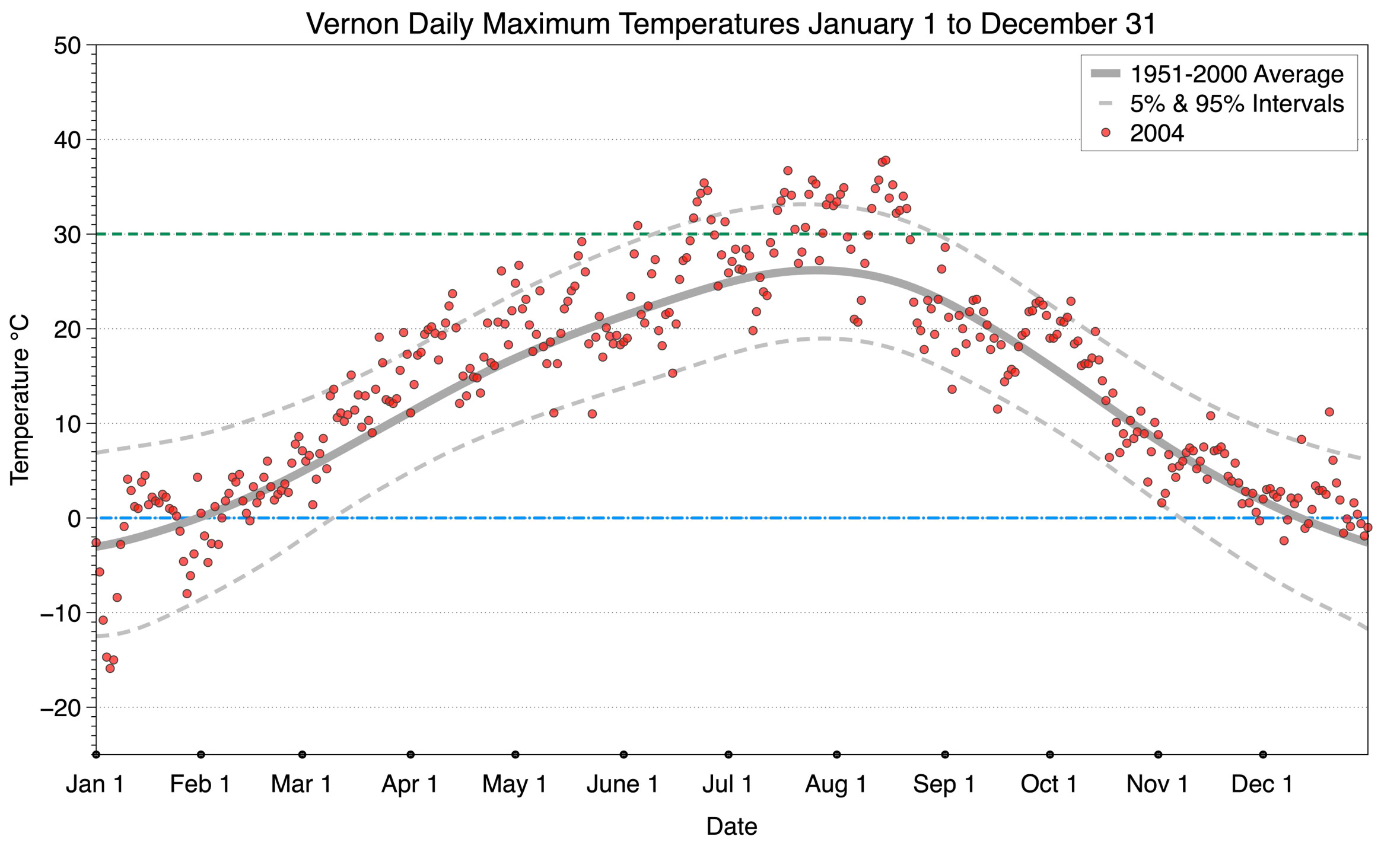 The graph below displays the day-to-day values of maximum daily temperature (red dots) at Vernon for the year 2004. On this graph, the dark grey thick center line is the average daily temperature calculated from 50 years of data from 1951 to 2000. The dotted light grey lines are the 5% and 95% probability intervals - about 90% of the data from 1951 to 2000 fell within these boundaries. Daily temperatures can be considered as extreme cold or extreme hot events if they that fall outside the 5% or 95% probability intervals, respectively. In Canada, temperatures above 30°C (green dotted line) are considered extreme daily temperatures.