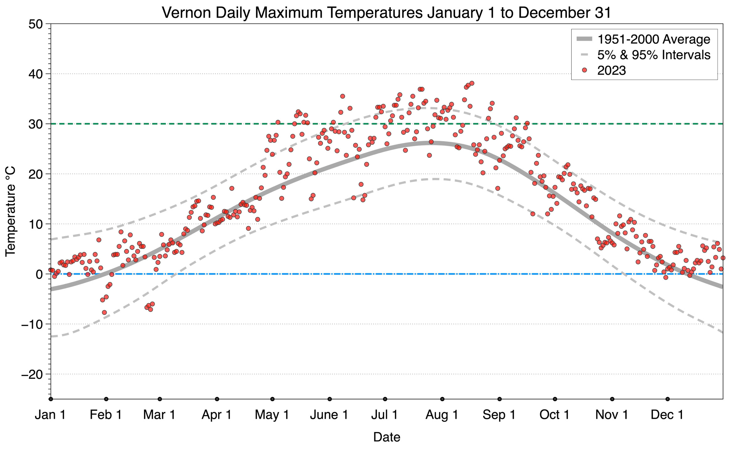 The graph below displays the day-to-day values of maximum daily temperature (red dots) at Vernon for the year 2023. On this graph, the dark grey thick center line is the average daily temperature calculated from 50 years of data from 1951 to 2000. The dotted light grey lines are the 5% and 95% probability intervals - about 90% of the data from 1951 to 2000 fell within these boundaries. Daily temperatures can be considered as extreme cold or extreme hot events if they that fall outside the 5% or 95% probability intervals, respectively. In Canada, temperatures above 30°C (green dotted line) are considered extreme daily temperatures.