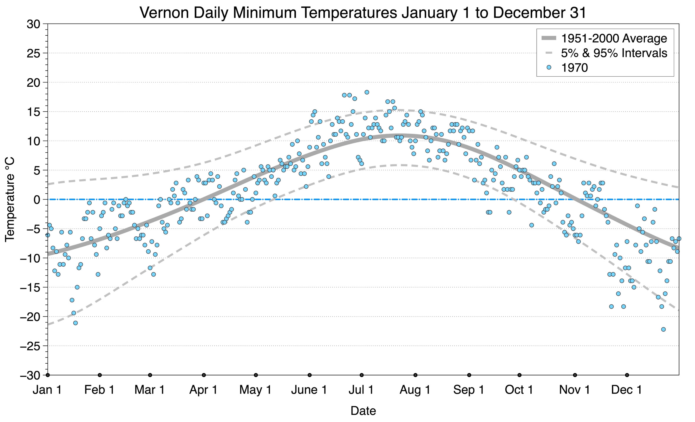 The graph below displays the day-to-day values of minimum daily temperature (blue dots) at Vernon for the year 1970. On this graph, the dark grey thick center line is the average daily temperature calculated from 50 years of data from 1951 to 2000. The dotted light grey lines are the 5% and 95% probability intervals - about 90% of the data from 1951 to 2000 fell within these boundaries. Daily temperatures can be considered as extreme cold or extreme hot events if they that fall outside the 5% or 95% probability intervals, respectively.