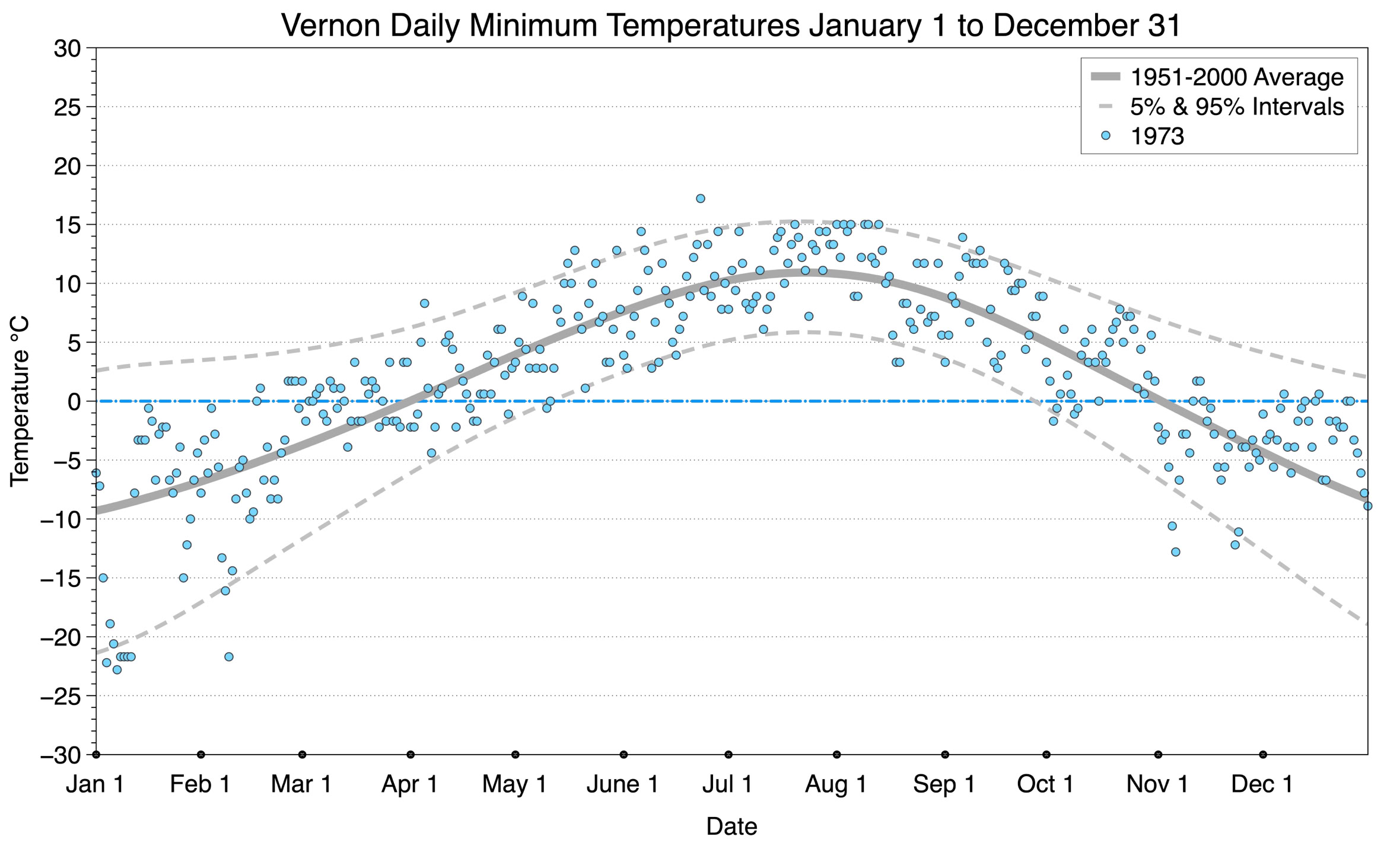 The graph below displays the day-to-day values of minimum daily temperature (blue dots) at Vernon for the year 1973. On this graph, the dark grey thick center line is the average daily temperature calculated from 50 years of data from 1951 to 2000. The dotted light grey lines are the 5% and 95% probability intervals - about 90% of the data from 1951 to 2000 fell within these boundaries. Daily temperatures can be considered as extreme cold or extreme hot events if they that fall outside the 5% or 95% probability intervals, respectively.