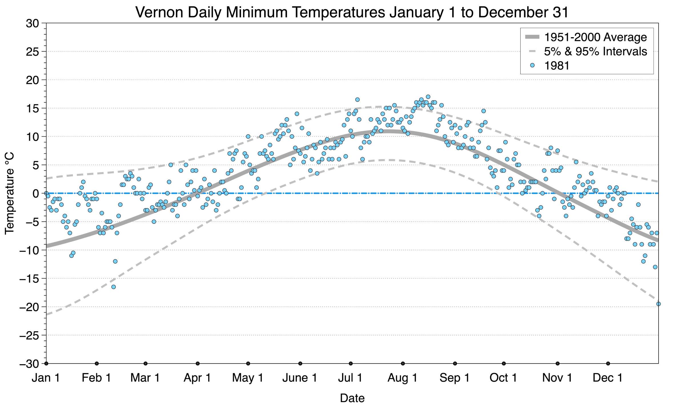 The graph below displays the day-to-day values of minimum daily temperature (blue dots) at Vernon for the year 1981. On this graph, the dark grey thick center line is the average daily temperature calculated from 50 years of data from 1951 to 2000. The dotted light grey lines are the 5% and 95% probability intervals - about 90% of the data from 1951 to 2000 fell within these boundaries. Daily temperatures can be considered as extreme cold or extreme hot events if they that fall outside the 5% or 95% probability intervals, respectively.