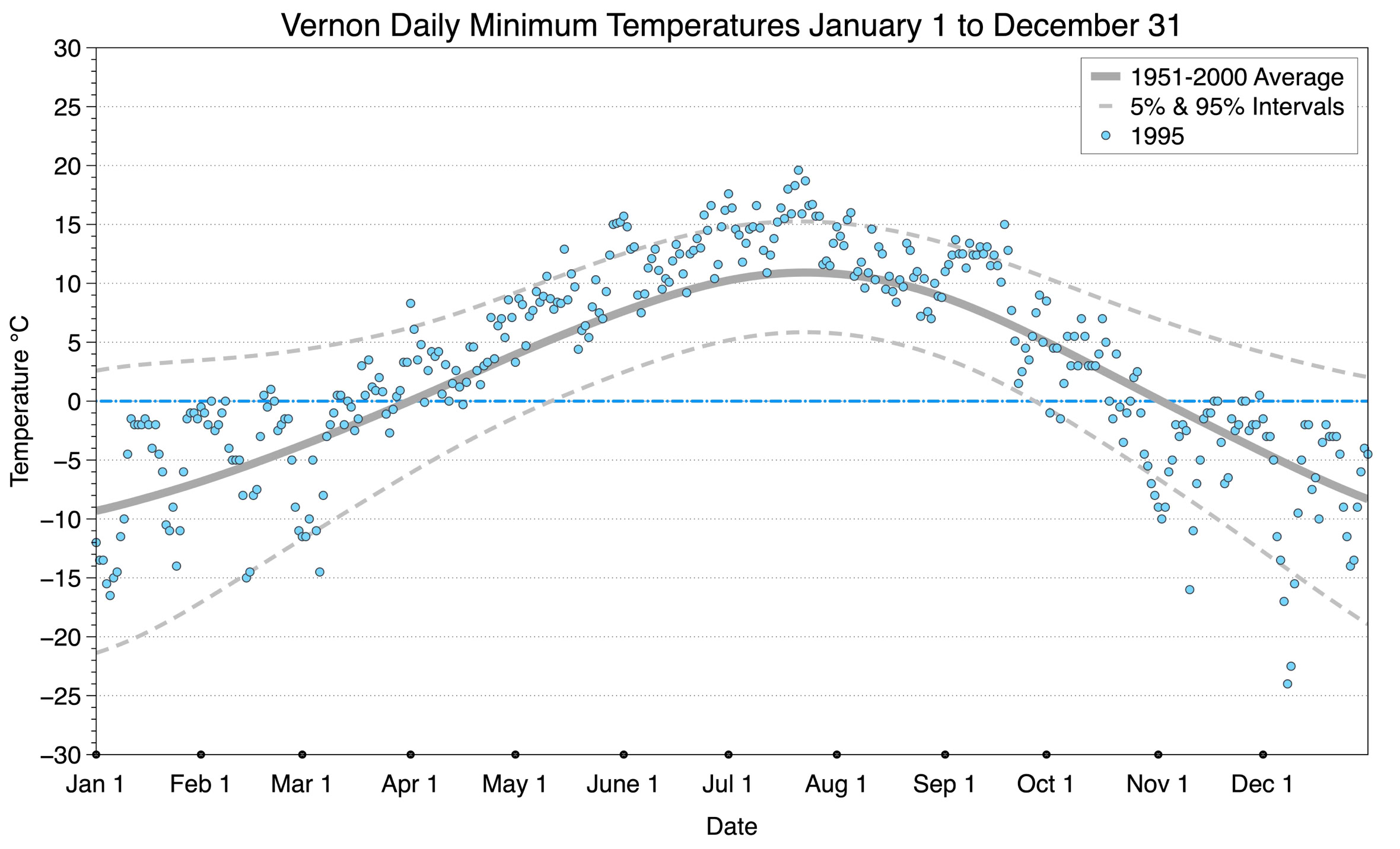 The graph below displays the day-to-day values of minimum daily temperature (blue dots) at Vernon for the year 1995. On this graph, the dark grey thick center line is the average daily temperature calculated from 50 years of data from 1951 to 2000. The dotted light grey lines are the 5% and 95% probability intervals - about 90% of the data from 1951 to 2000 fell within these boundaries. Daily temperatures can be considered as extreme cold or extreme hot events if they that fall outside the 5% or 95% probability intervals, respectively.