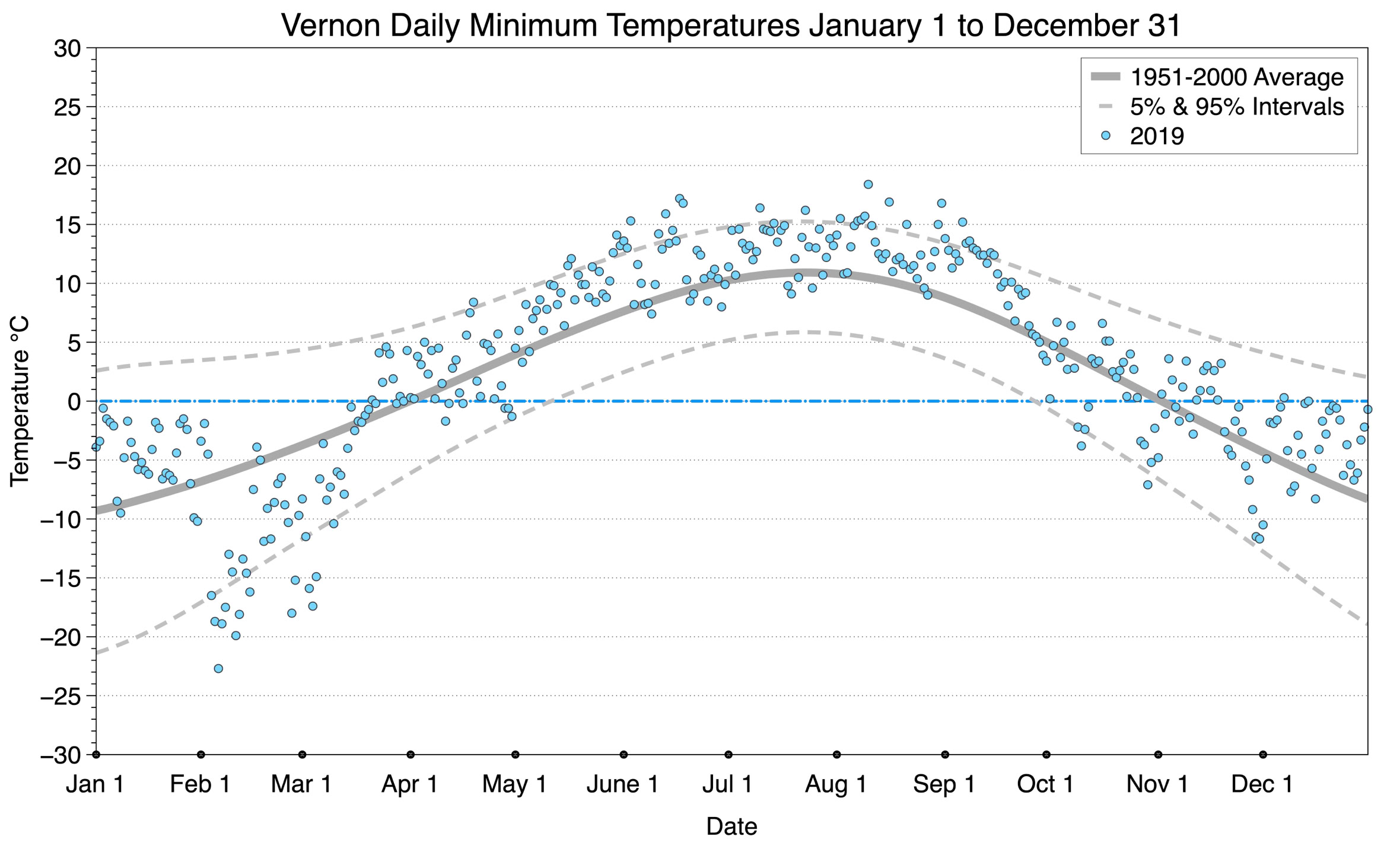 The graph below displays the day-to-day values of minimum daily temperature (blue dots) at Vernon for the year 2019. On this graph, the dark grey thick center line is the average daily temperature calculated from 50 years of data from 1951 to 2000. The dotted light grey lines are the 5% and 95% probability intervals - about 90% of the data from 1951 to 2000 fell within these boundaries. Daily temperatures can be considered as extreme cold or extreme hot events if they that fall outside the 5% or 95% probability intervals, respectively.