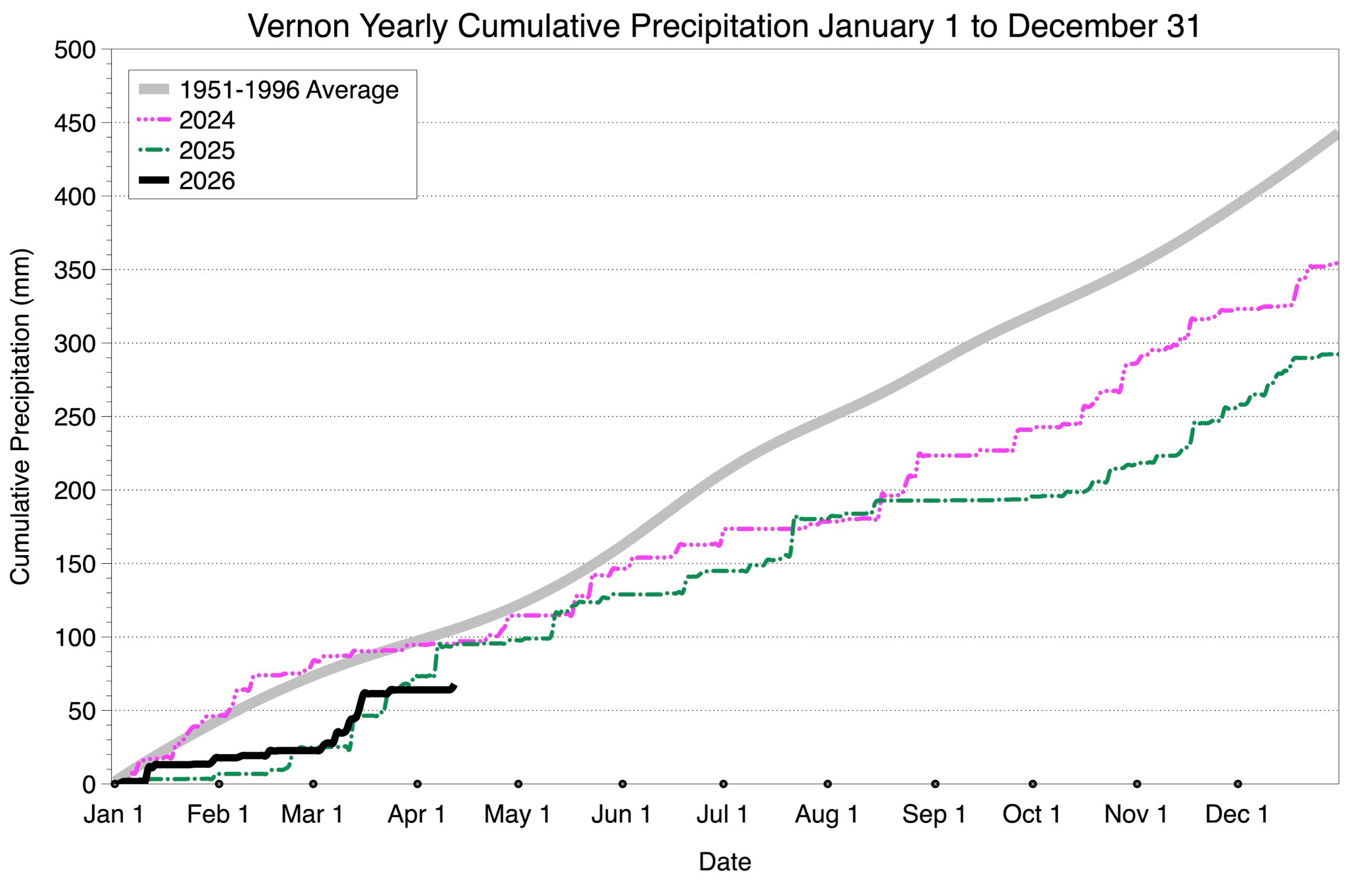 The graph below shows Vernon’s cumulative precipitation from January 1 to December 31. Three years are displayed - 2026, 2025, and 2024. The grey thick line is the average cumulative precipitation calculated from 45 years of data from 1951 to 1996 (minus 1963 because of missing daily observations). Average total cumulative precipitation for 1951 to 1996 by December 31 is 426 mm. As shown, 2026 has a current cumulative precipitation around 65% of the 1951 to 1996 average.
